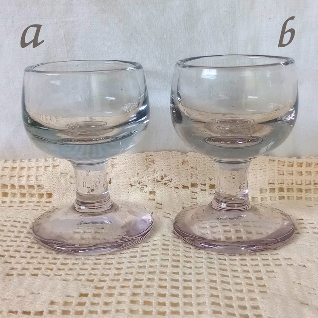パリのアンティークフェアでみつけたちょっと変わったぽってりと分厚いグラスです。 グラスの上部はグレーがかった色でグラスの底の部分とステムから下はうすく紫がかったガラスです。ガラスはとろんとし大小の気泡が入っていて厚さも4mmくらいございます。 aとbで出品しておりまして、若干bのグラスの方が底が厚めです。 【価格】 税込4900円 【サイズ】 直径6.5cm×高さ10.5cm アンティーク・ヴィンテージは古いもののため長い間人から人へ渡る間に一緒に年代も経てきておりますのでダメージや変色などあるものもございます。写真でできる限りお伝えは致しておりますが古いものというご理解をいただけると幸いでございます。