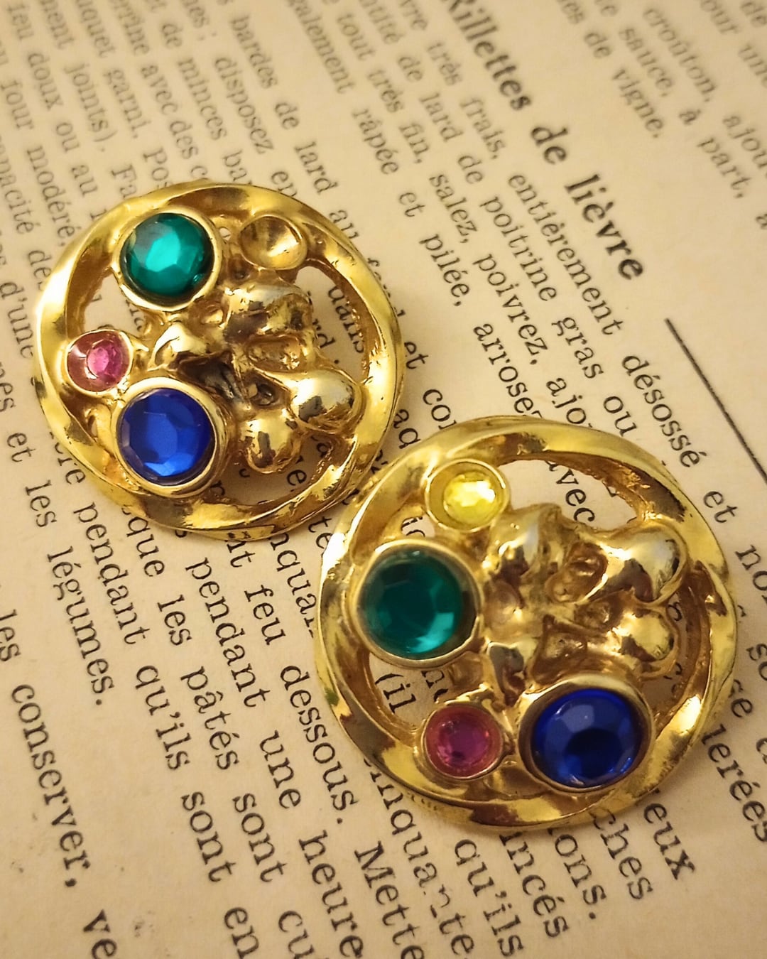 フランスより届きました、ゴールドのメッキボタン(中身は金属です)に大小カラフルな石が埋め込まれた可愛いボタンです。アクセサリーにされても可愛いかと思います。