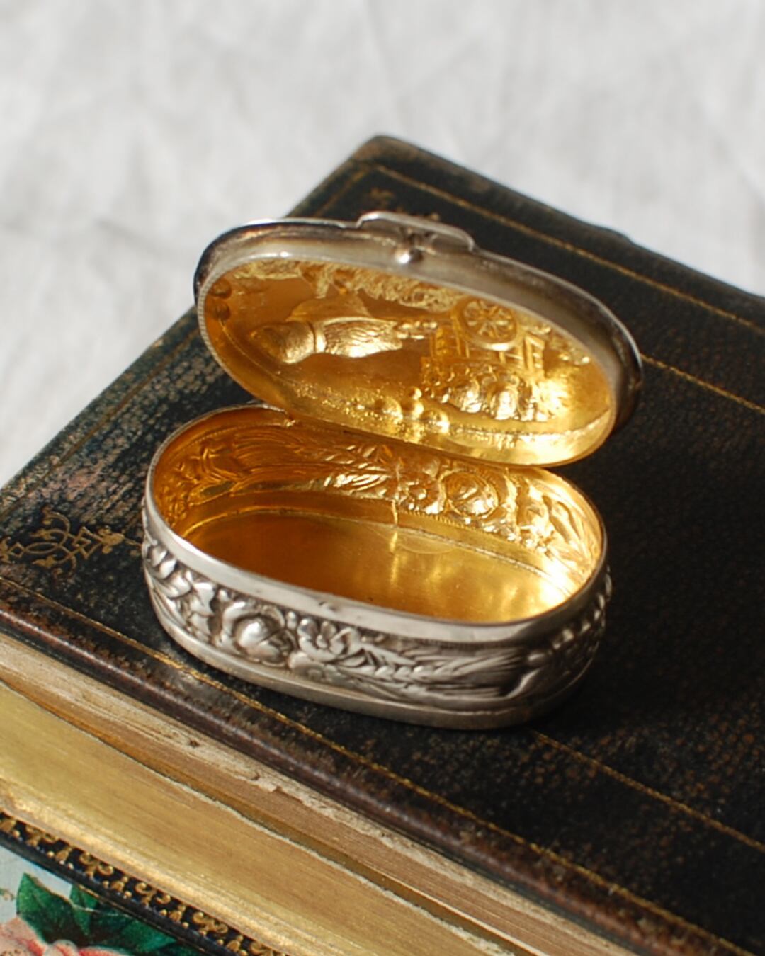フランスのアンティークショップで出会いました、小さなシルバー935の刻印が入った楕円型のピルケースです。鳥がお花のバスケットをひいているそんな可愛いらしいデザイン。側面の装飾もフルーツやお花ととても手のこんだものです。中の状態もとても良く素敵なシルバーのピルケースです。
