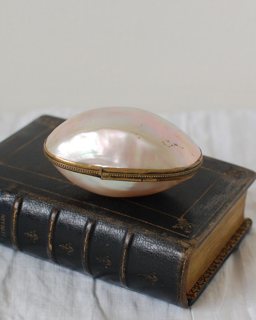 フランスで買い付けました、マザーオブパールの古いロザリオケースです。貝の縁には真鍮の枠組みがついておりパチンとしまります。中身もきれいな状態です。