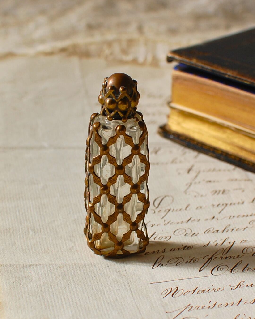 フランスで買い付けました、真鍮の編み目の装飾がガラスに施された古い香水ボトル。編み目1つ一つがとても凝ったお作りの素敵なお品です。
