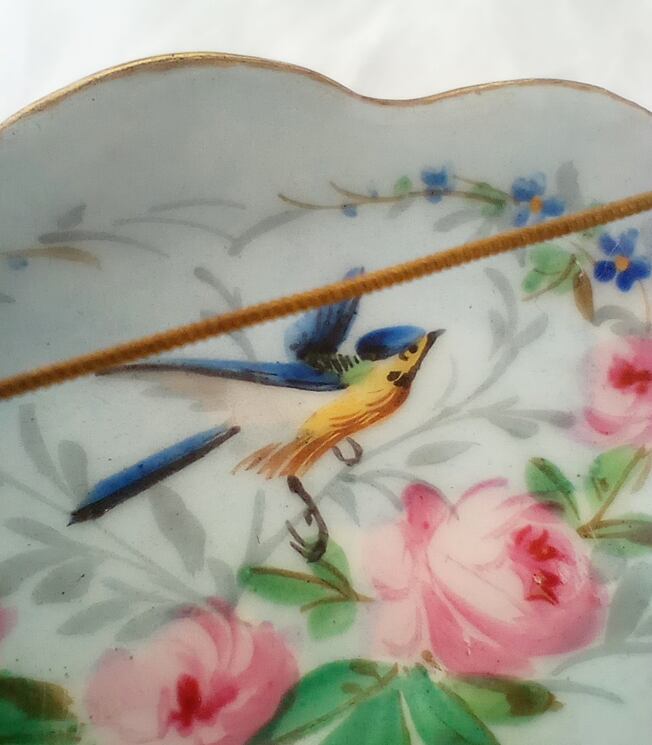パリの蚤の市で見つけました、糸巻機のかたちをした小さなアクセサリートレーです。糸巻の枠組みは真鍮、トレーの部分は陶器製でふっくらとしたピンクのローズと羽ばたいている燕が手描きで描かれております。アクセサリートレーではございますが、そのまま飾っておくだけでも素敵なアイテムです。