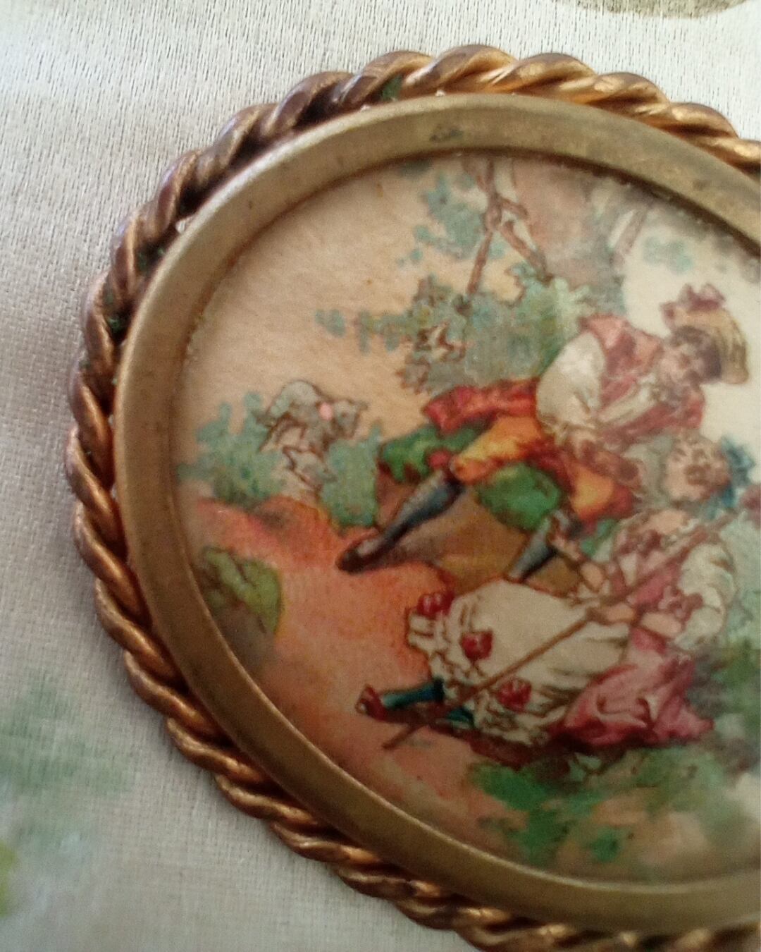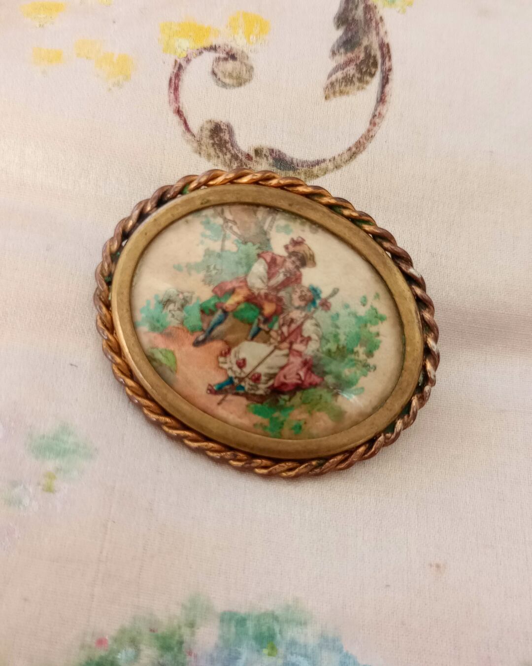フラゴナールの求愛の絵柄がとても可愛い野菜いお色味のブローチです。