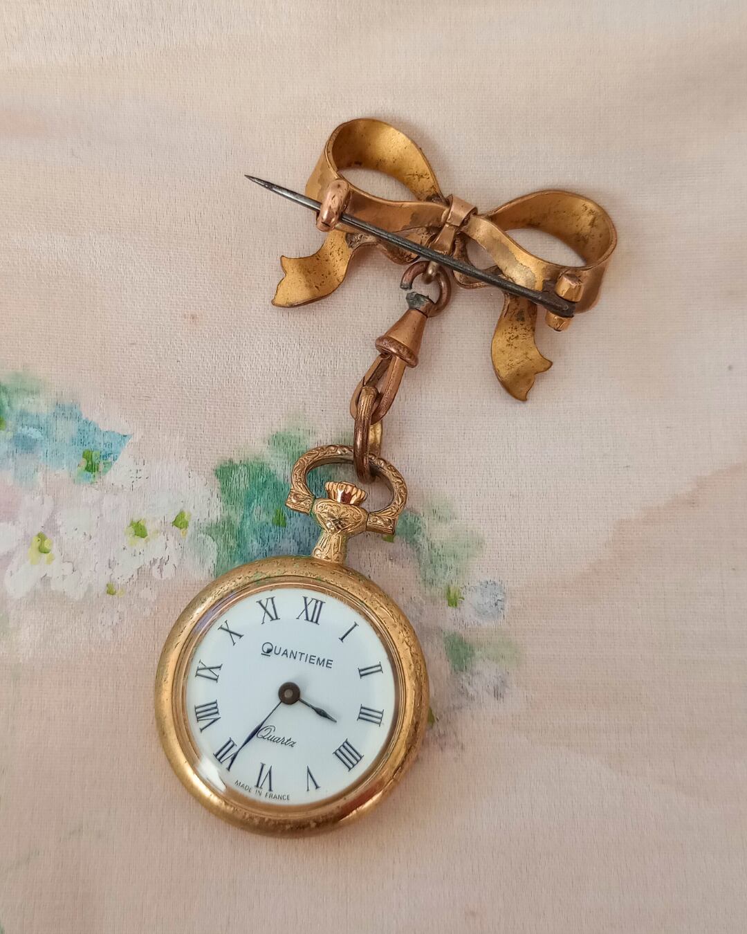 フランスより届きました、ゴールドメッキのリボンに小さな時計がついたブローチです。