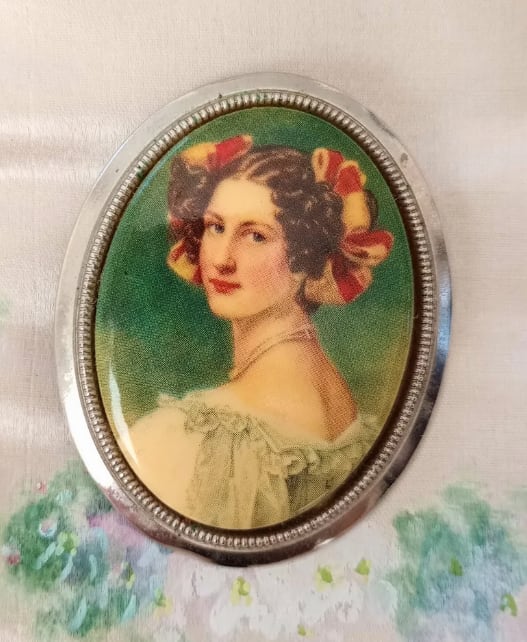フランスより届きました、旧西ドイツのヴィンテージブローチ(背面にwstrern germanýの文字あり)オーバル型のメタルの枠に首もとが大胆にあいたドレスをまとった女性のモチーフ。