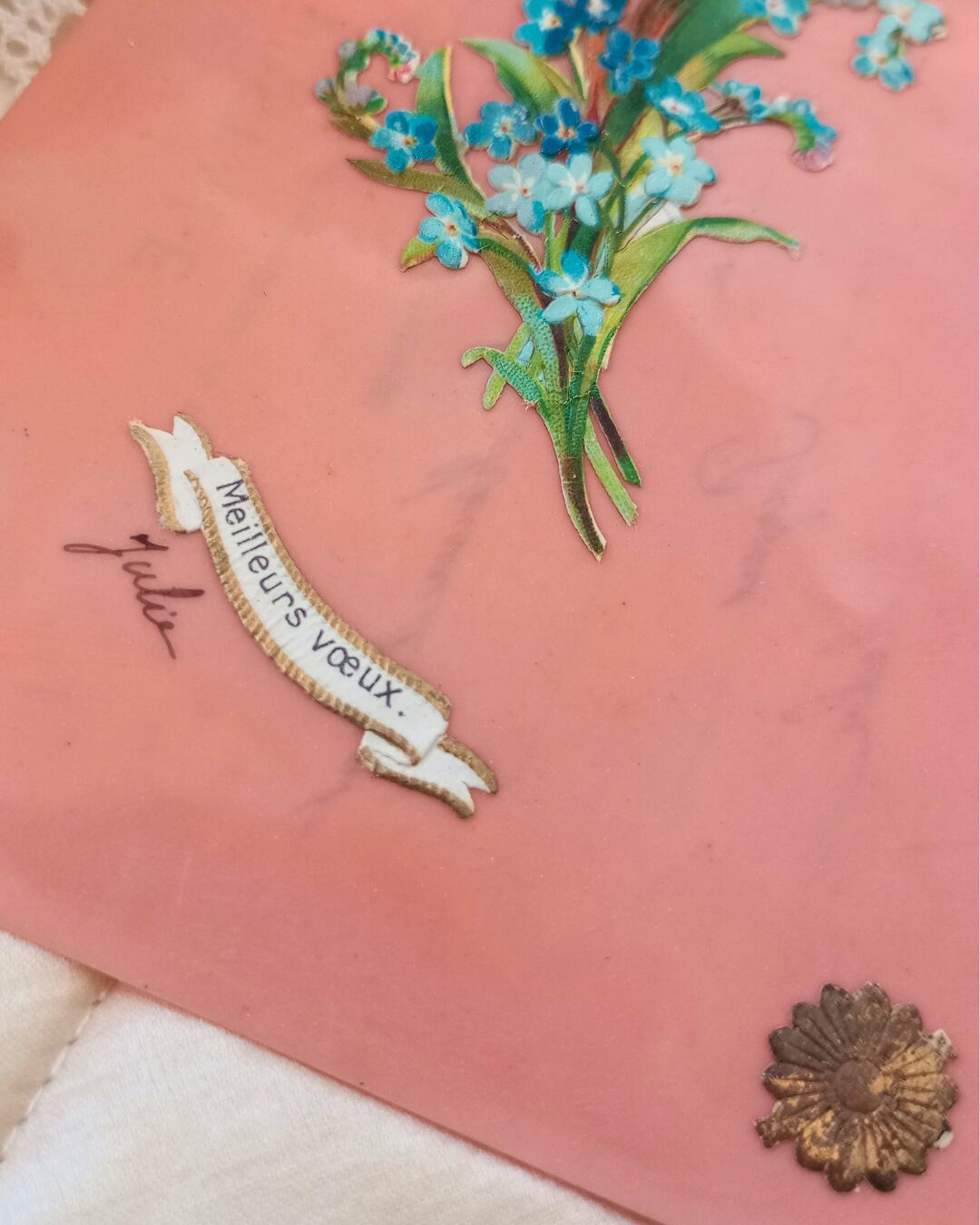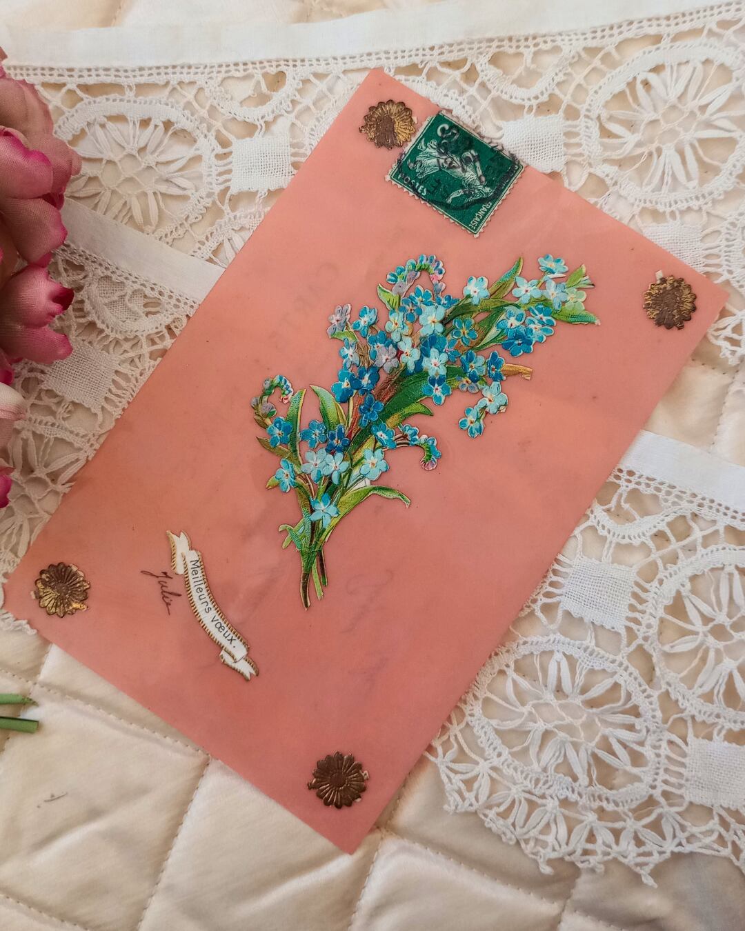 ピンクのセルロイドに水色の忘れな草のブーケのクロモスがシンプルに入った素敵なカードです。