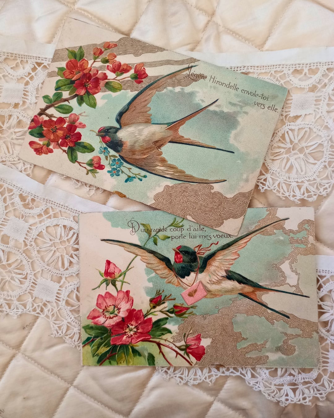 ツバメがレターを運んでいる様子と、勿忘草のお花をくわえて優雅に飛んでいる様子のカード2枚セットに致しました。