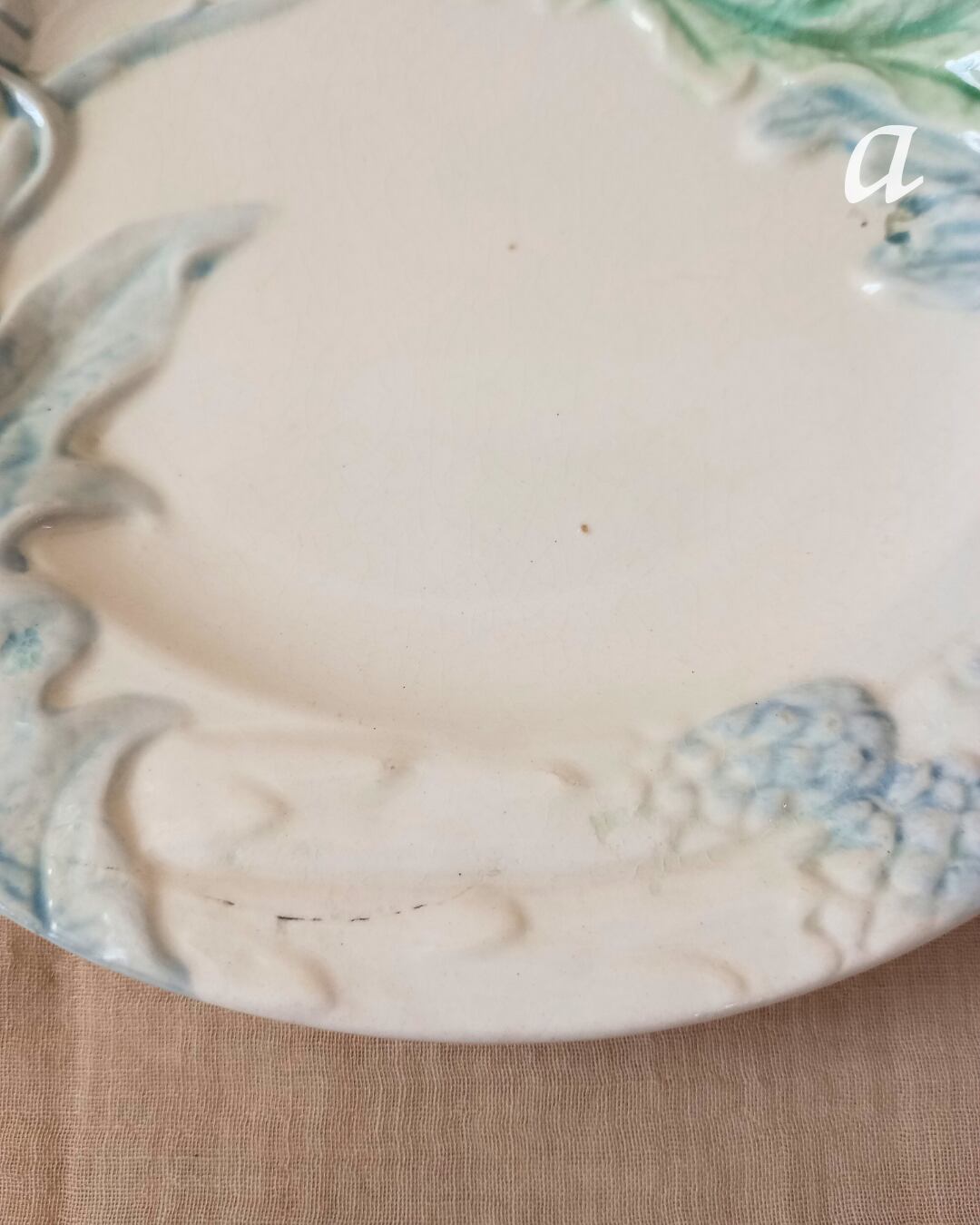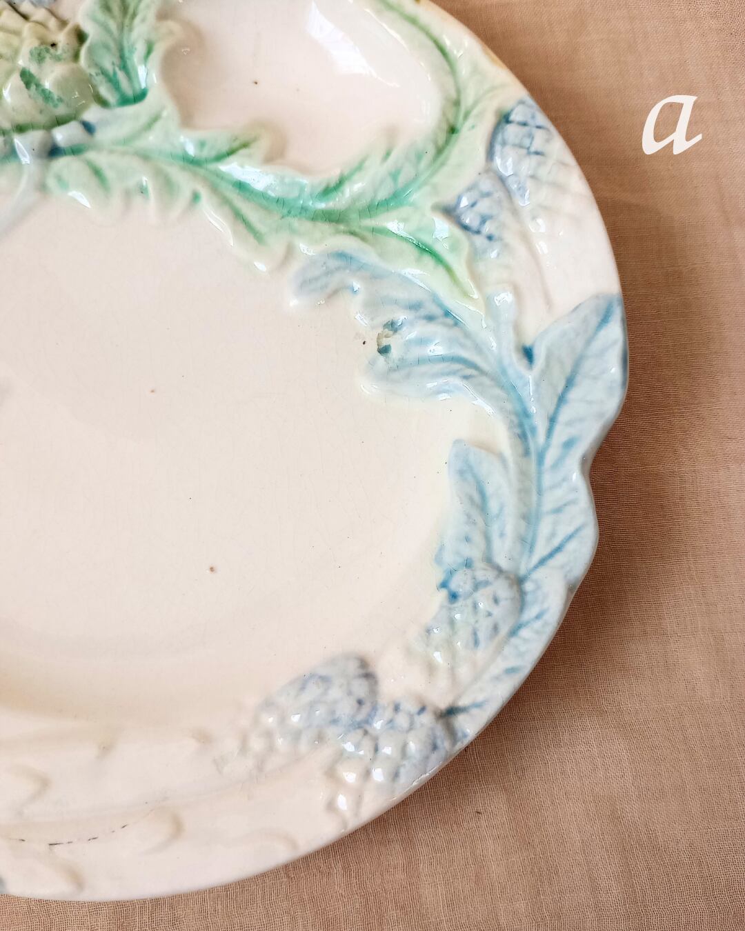 フランスより届きました、1900年代初期の古いバルボティーヌのアンティークプレートです。白地に青系と緑色の着彩でアーティチョークのレリーフが素敵です。