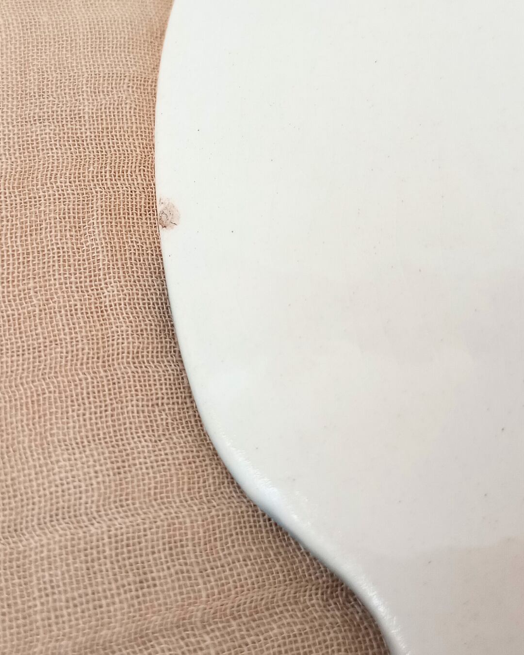 製造時についたごく小さな黒点のようなものが数か所入っております。お皿裏面には数か所剥がれた後と、小さな欠けがございます。