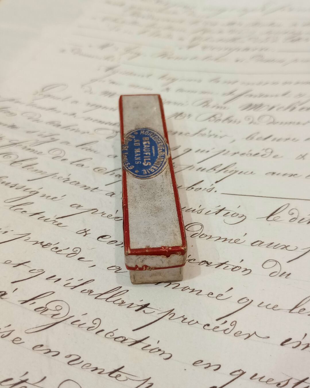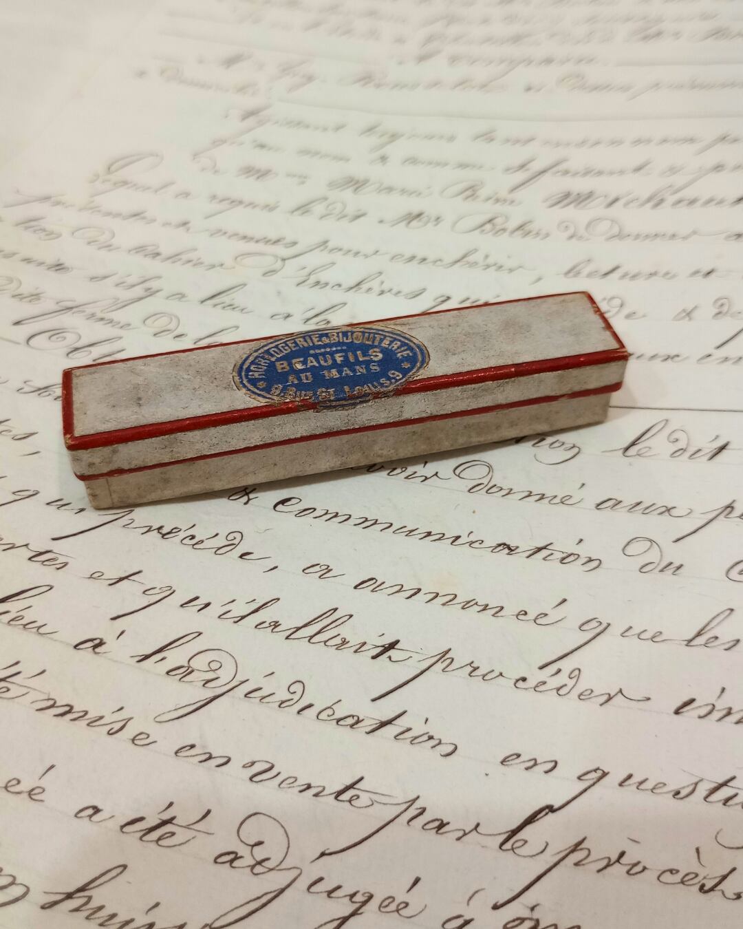 ル・マンの時計と宝石を扱うお店の箱で「BEAUFILS」というショップ名が入っております。かなり細長く小さくてレアなお箱です。時計の針か何かが入っていたのでしょうか?