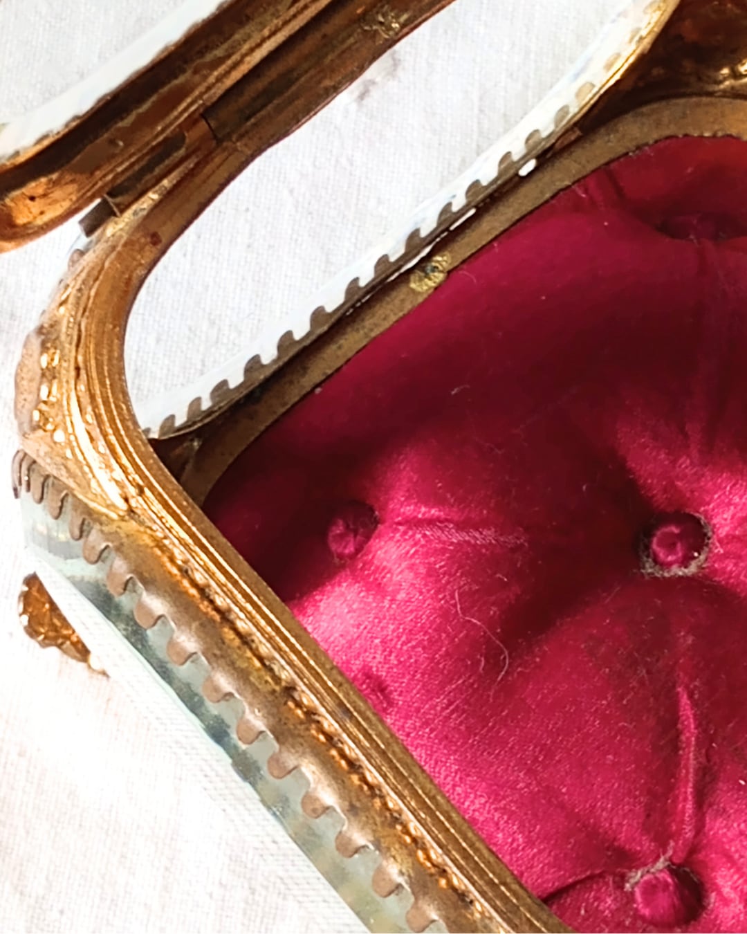 中敷きのシルクは華やかな赤、クッションの状態がとても良く残っています。