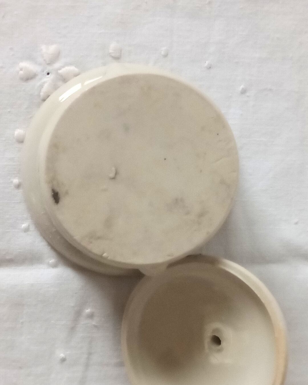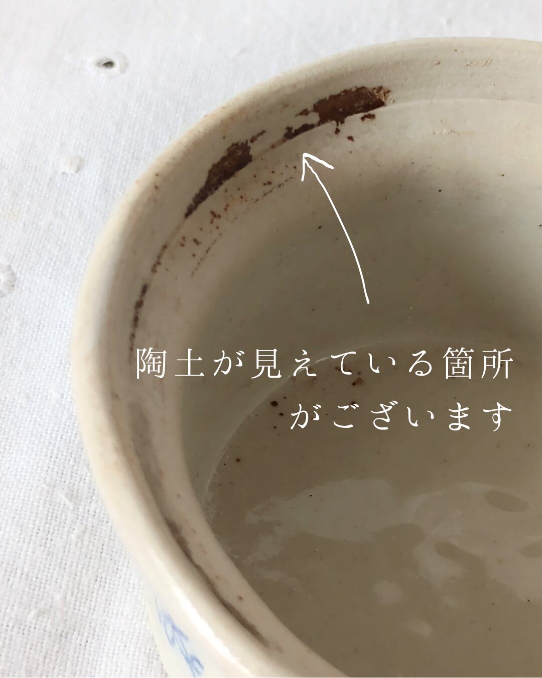 器のふちに陶土が剥げて見えて見えてしまっている箇所がございます。汚れではございません。またフタも若干歪んでおります。