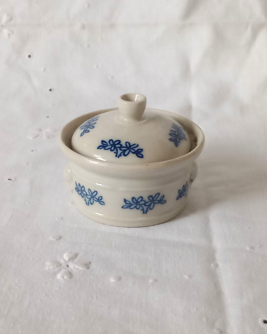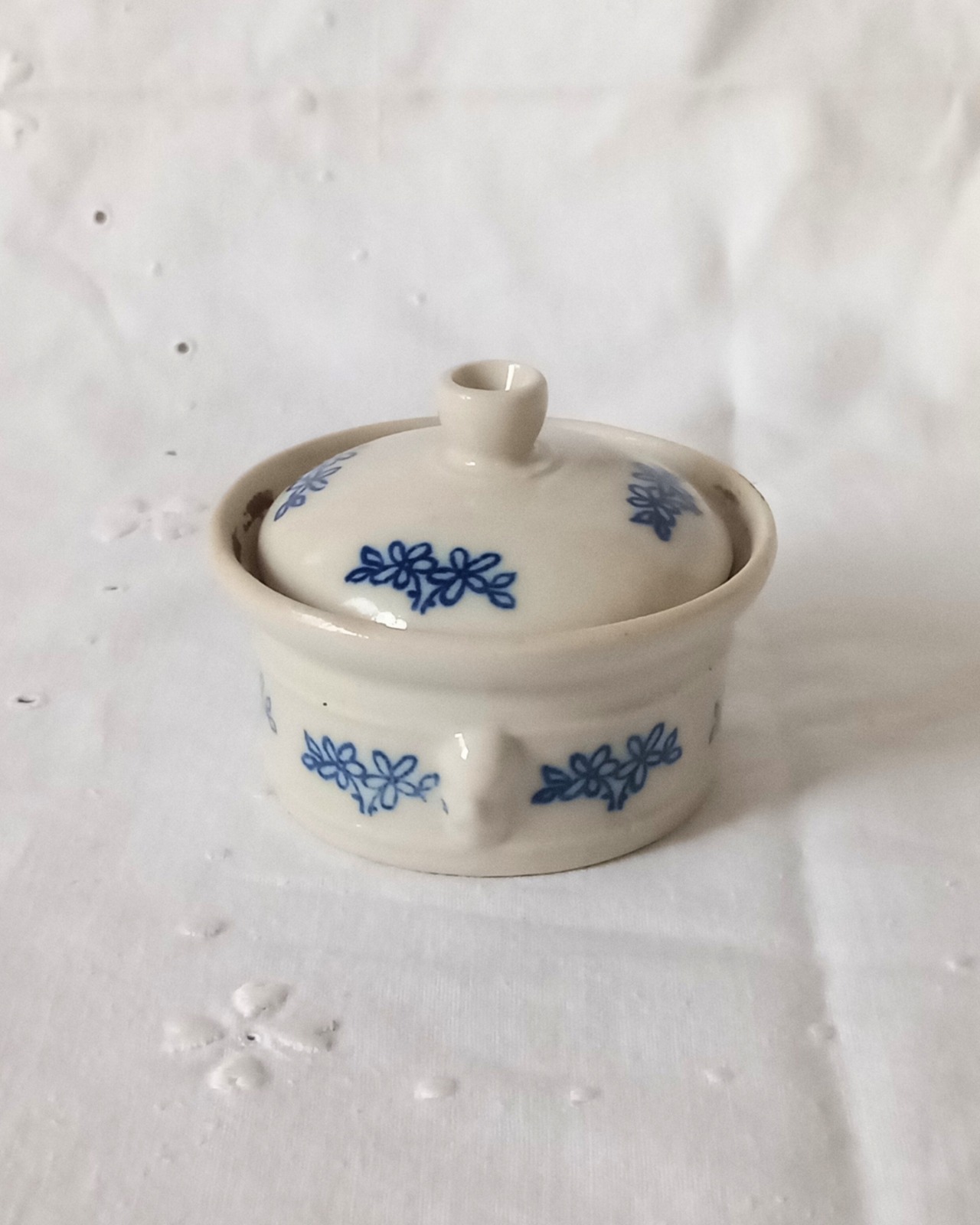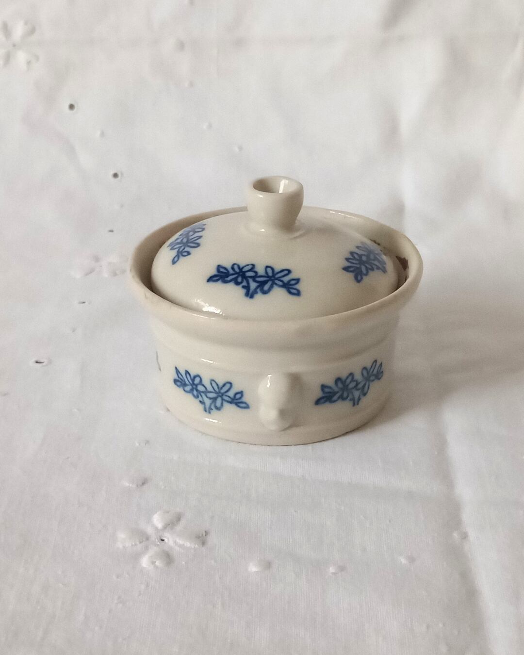 フランスより届きましたSaint uze窯(サンチューズ)ディネット(おままごと)1930年頃までのお品で、こちらは小さなキャセロールです。シンプルなストーンカラーにブルーのお花の装飾が愛らしいアイテムです。