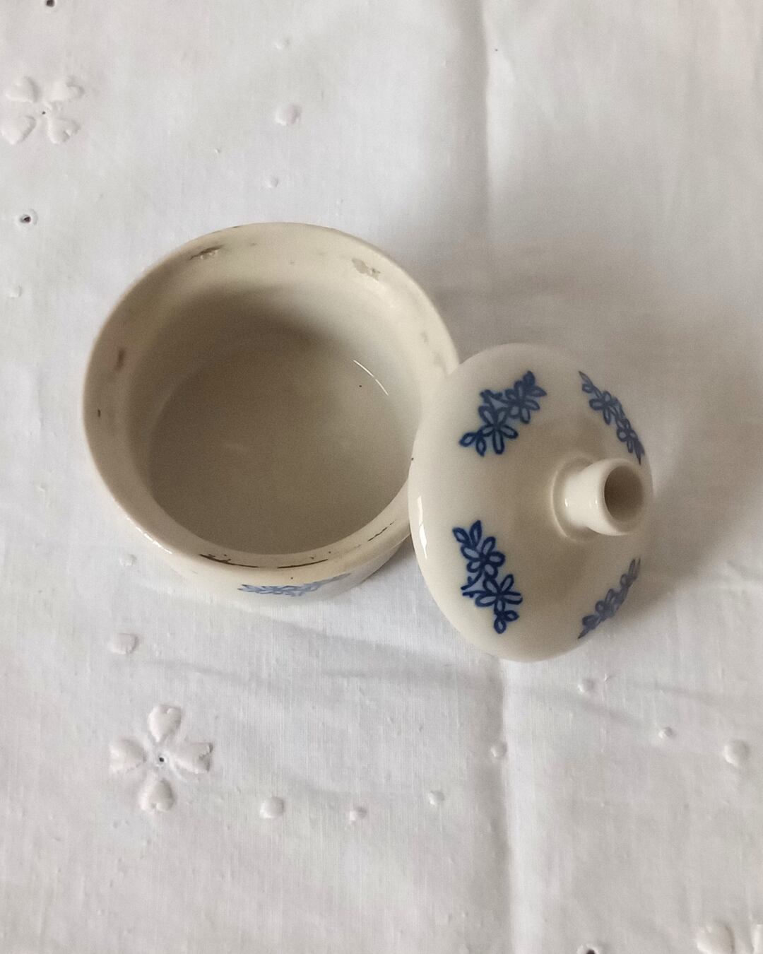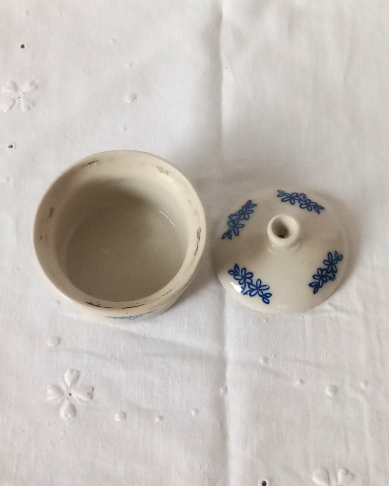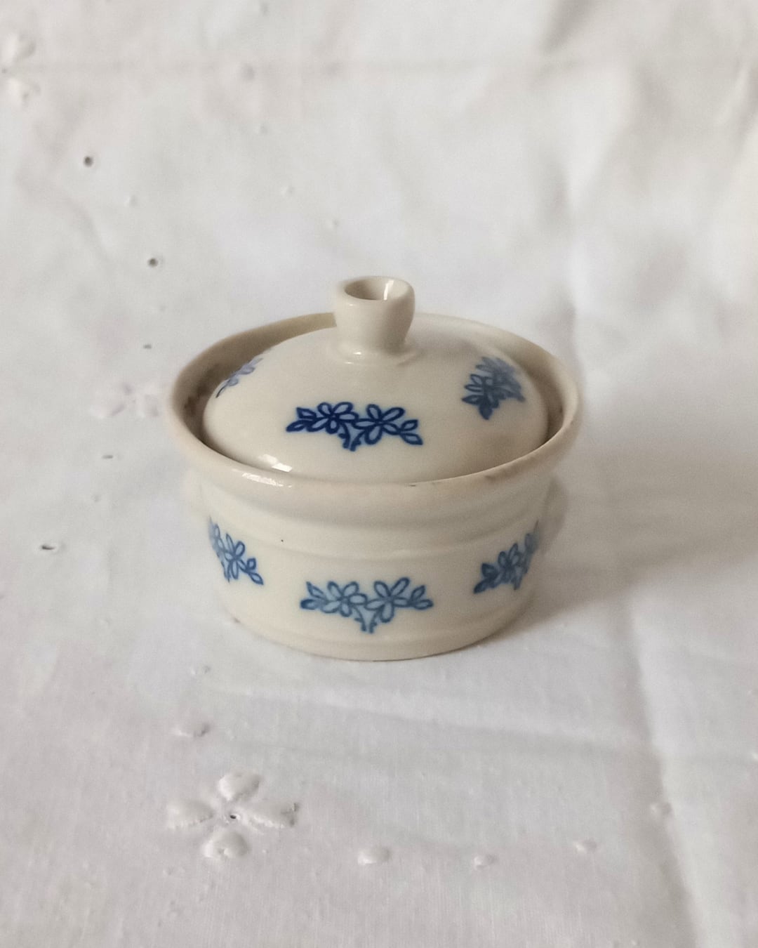 フランスより届きましたSaint uze窯(サンチューズ)ディネット(おままごと)1930年頃までのお品で、こちらは小さなキャセロールです。シンプルなストーンカラーにブルーのお花の装飾が愛らしいアイテムです。