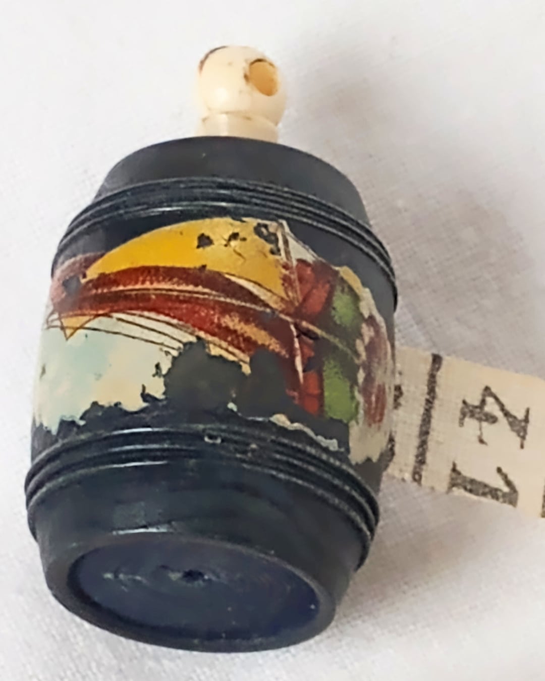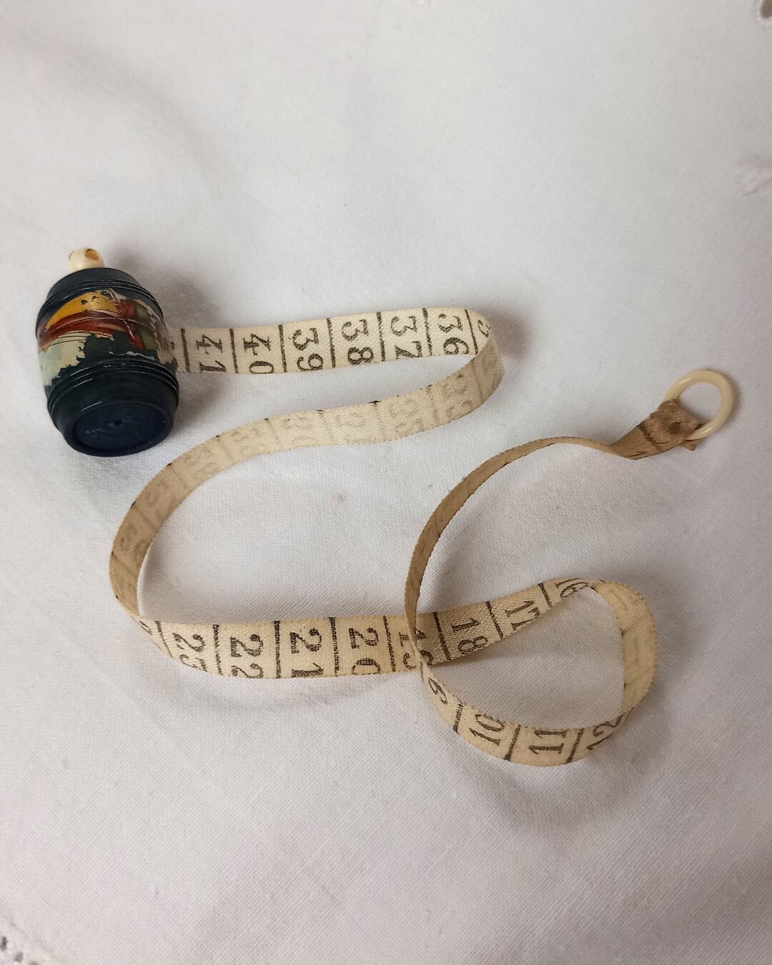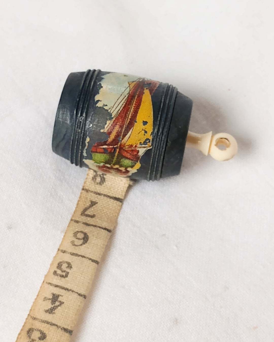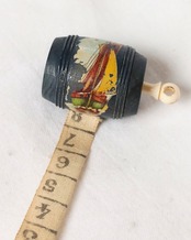 フランスより届きました、アンティークの木製の小さな樽型メジャーです。レアな黒のお色でFort Mahonの文字が入っていた跡がございます。本体の表面に入っている絵柄はヨットで横向きにプリントされております。くるくると回すつまみはアイボリーカラー、メジャー部分の布は生成りでメモリの3㎝あたりまでシミがございます。