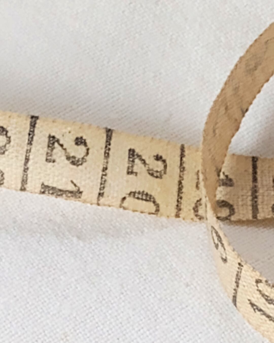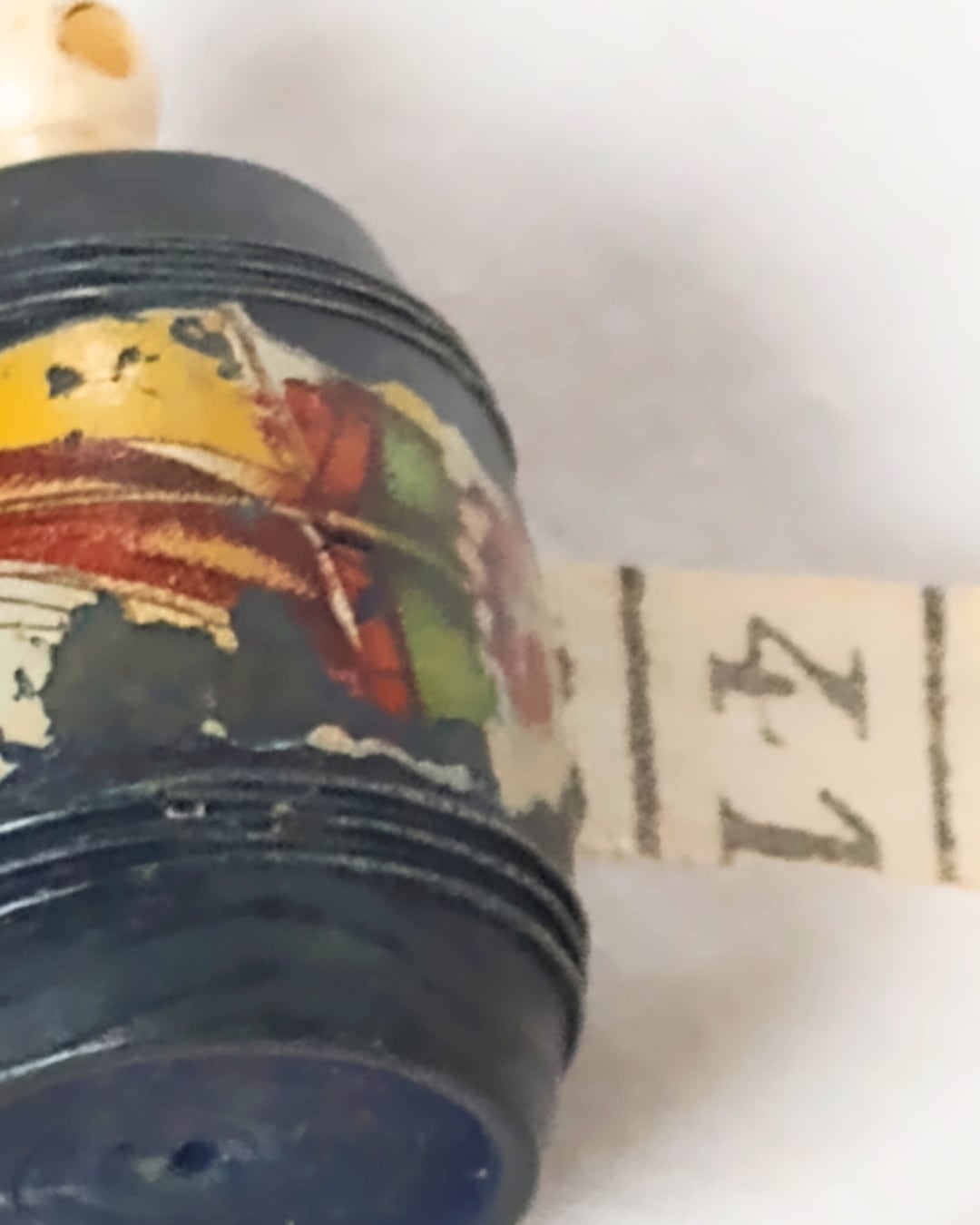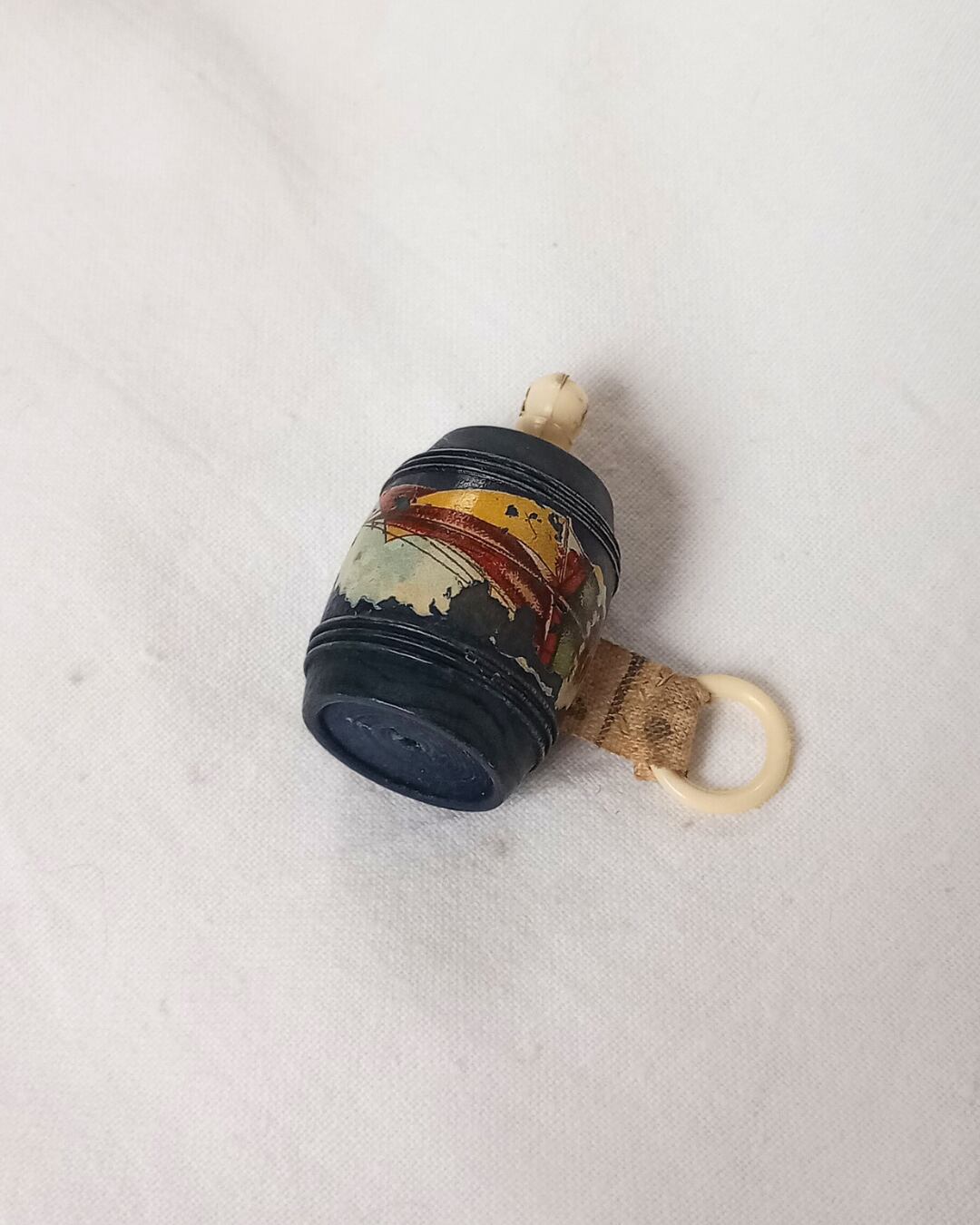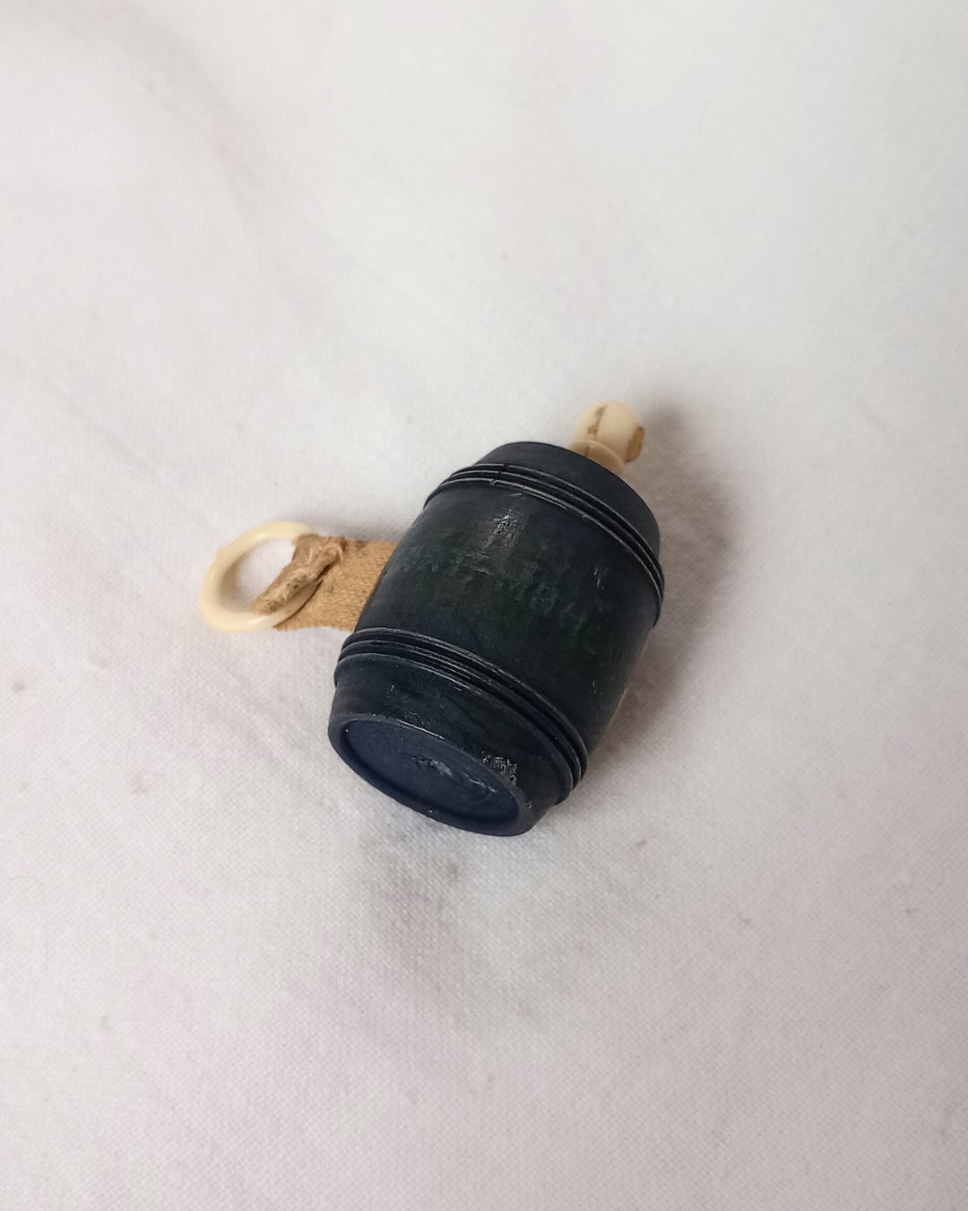 フランスより届きました、アンティークの木製の小さな樽型メジャーです。レアな黒のお色でFort Mahonの文字が入っていた跡がございます。本体の表面に入っている絵柄はヨットで横向きにプリントされております。くるくると回すつまみはアイボリーカラー、メジャー部分の布は生成りでメモリの3㎝あたりまでシミがございます。