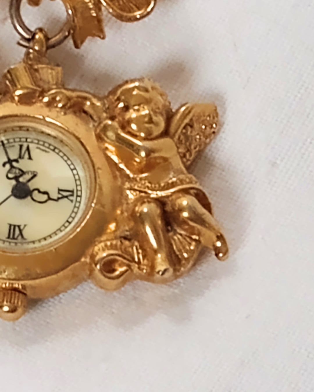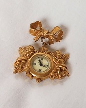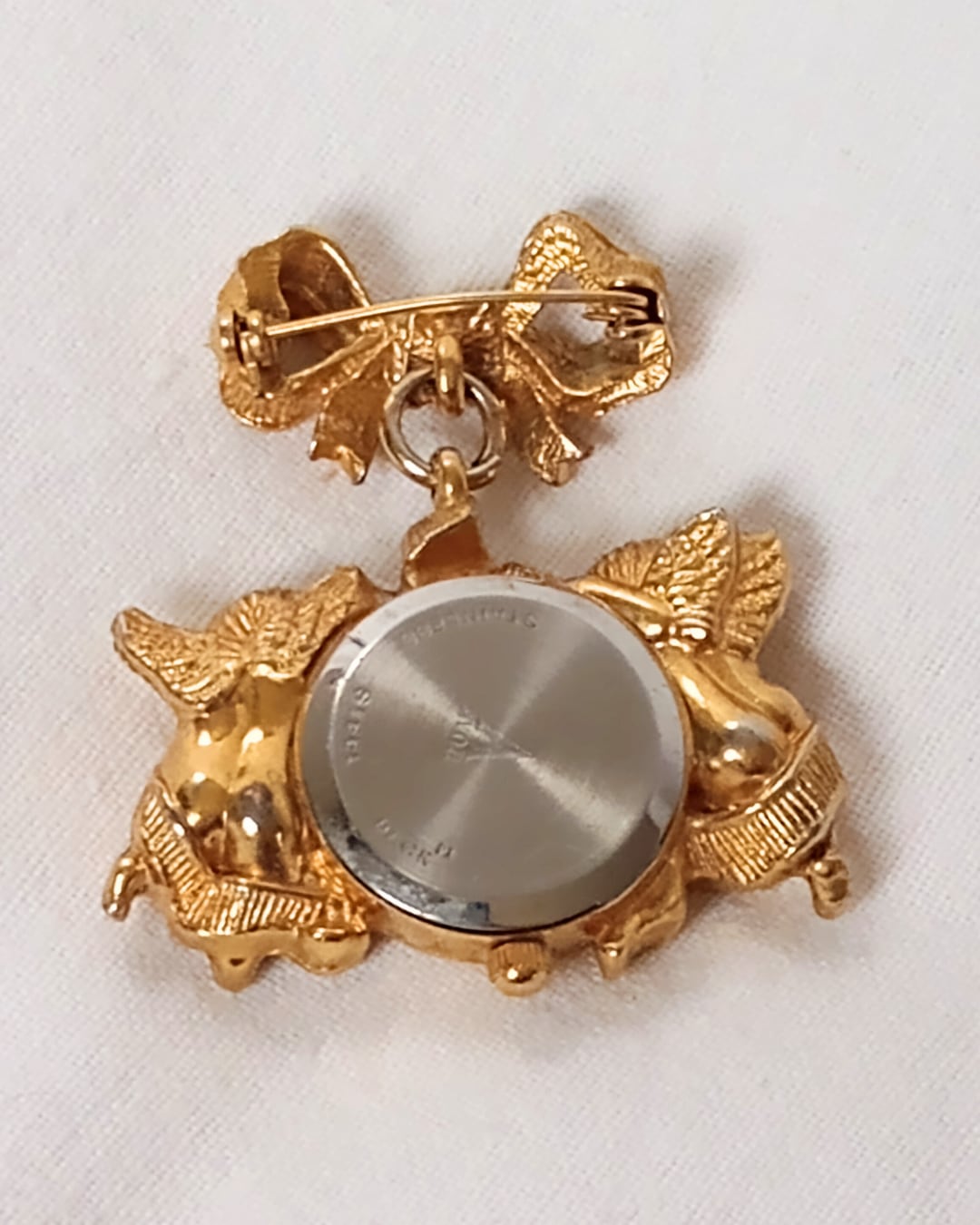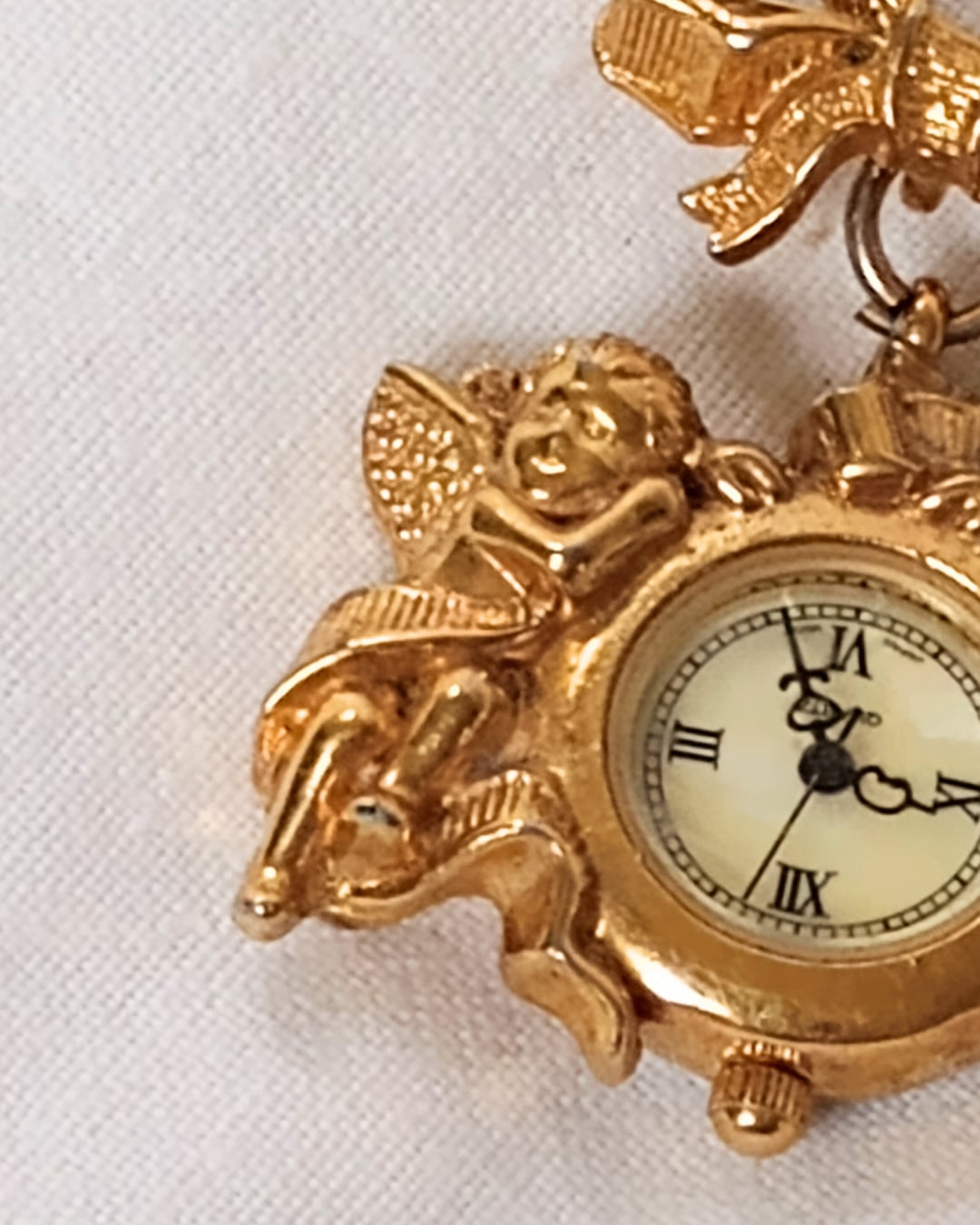 フランスより届きました、ゴールドメッキのリボンに小さな時計がついたヴィンテージのブローチです。時計の両サイドには愛らしい天使が2体ととても可愛いデザインです。