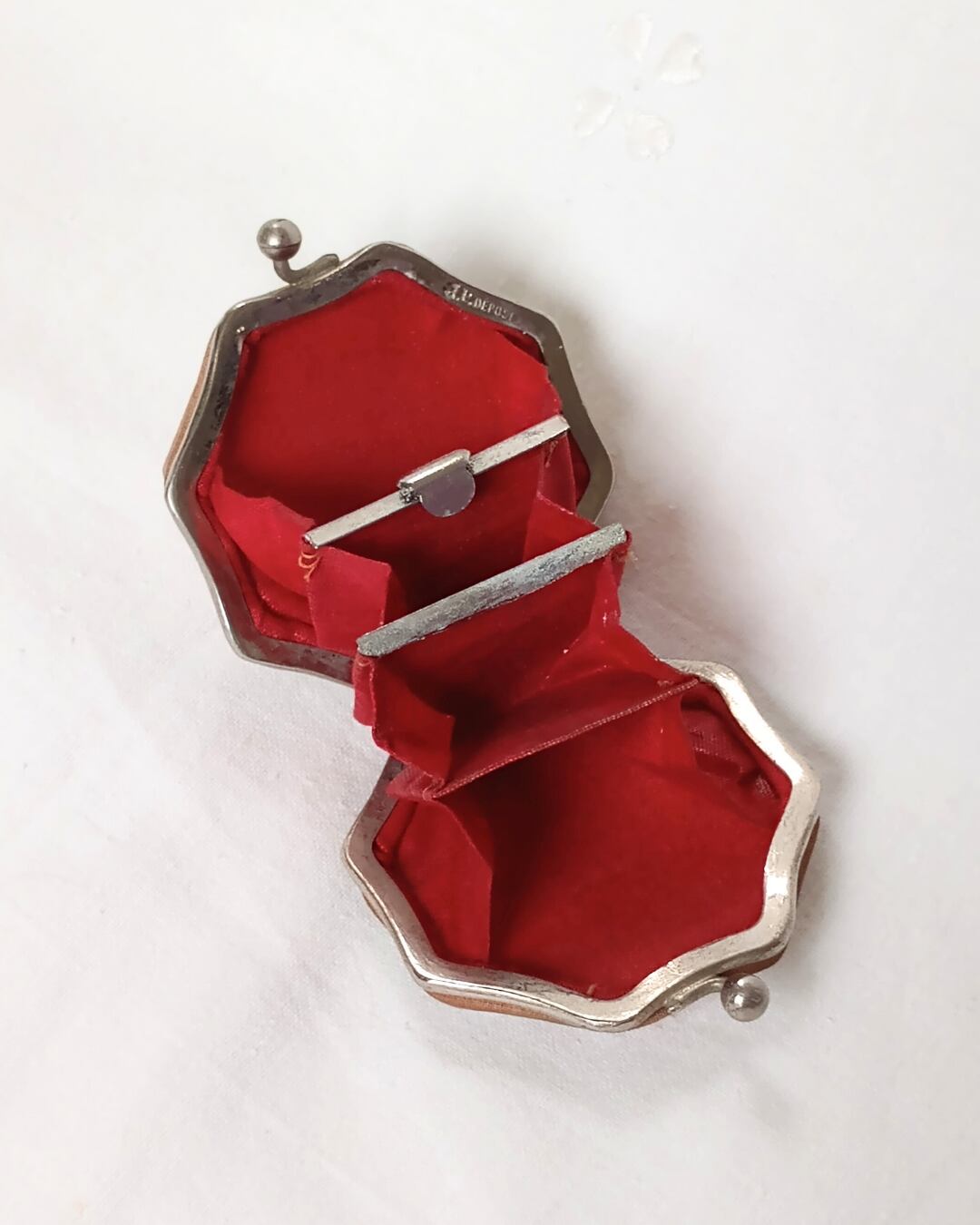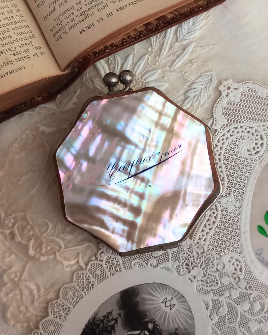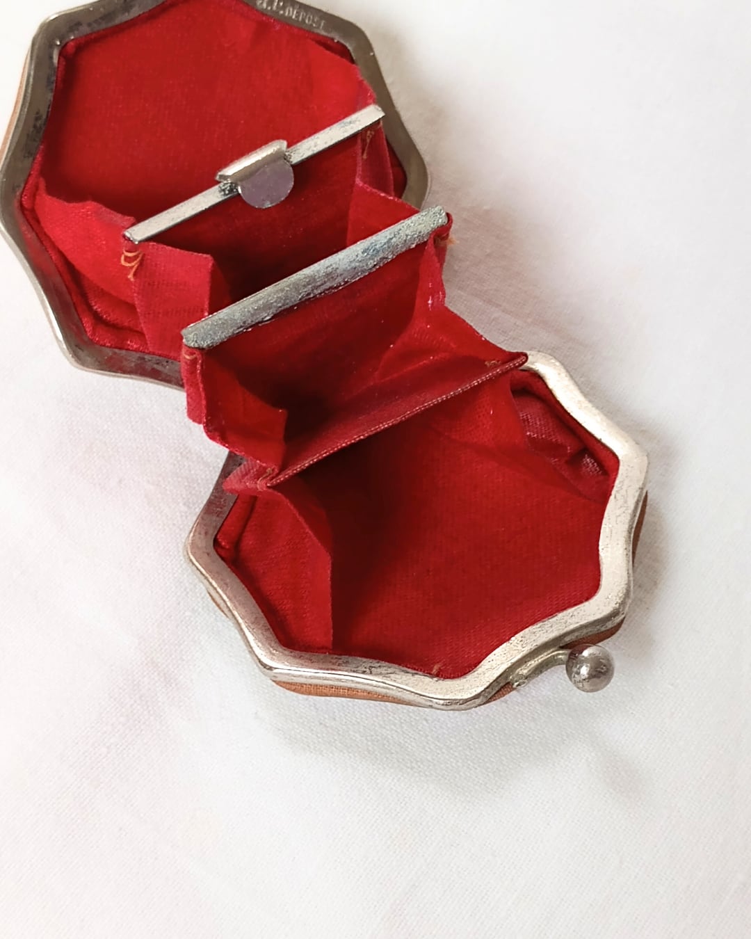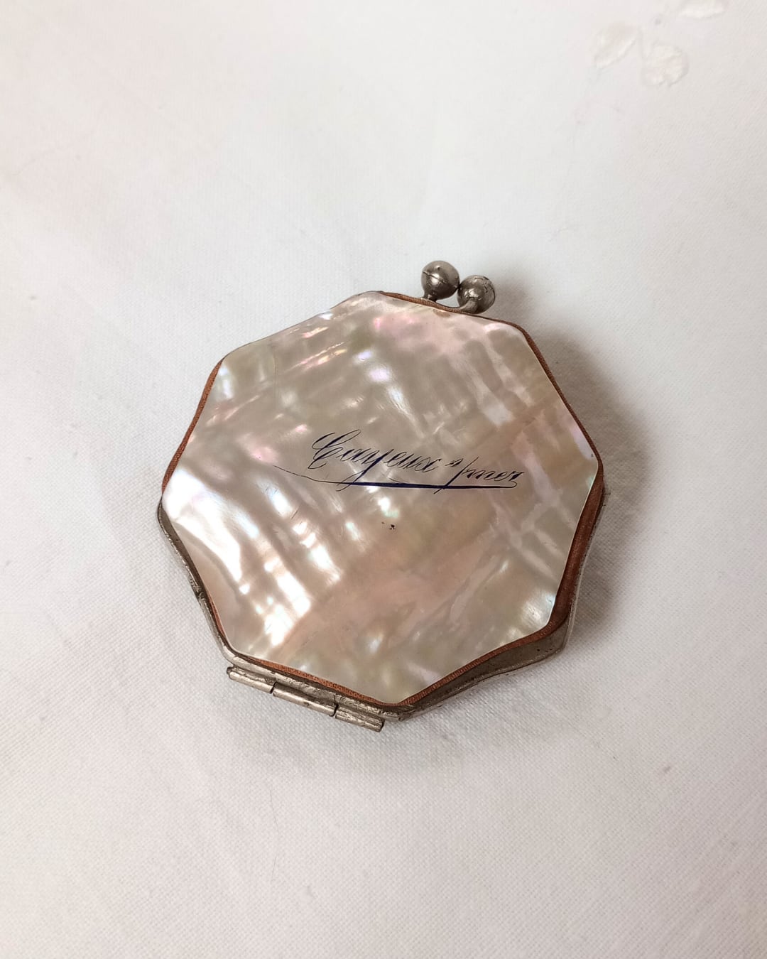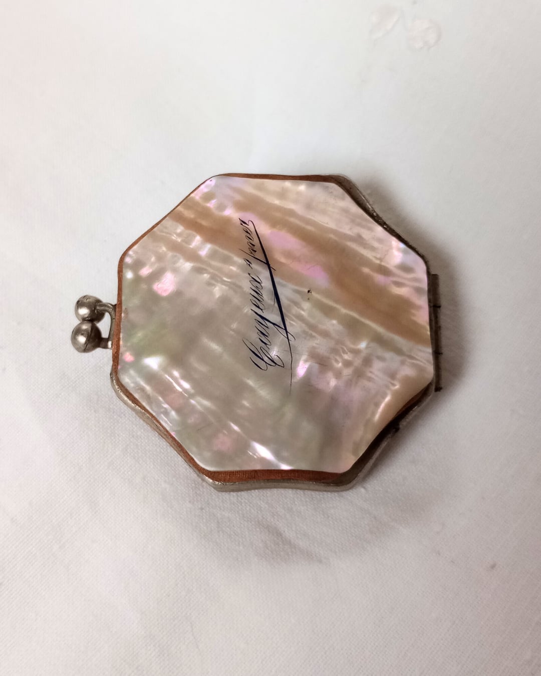 フランスより届きました、マザーオブパールのがま口(コインパース)でその昔お土産だったものです。優雅なカリグラフィーの文字が流れるように書かれています。中身の生地は赤のタイプで外側の真珠母貝の部分レアな六角形のかたちをし状態もとても良いものです。