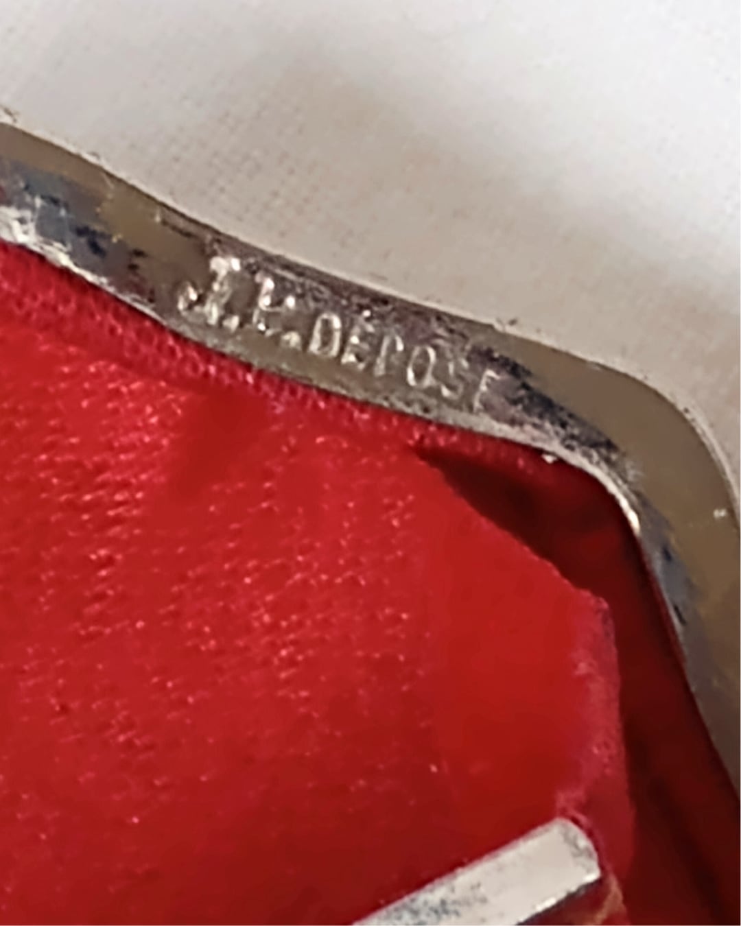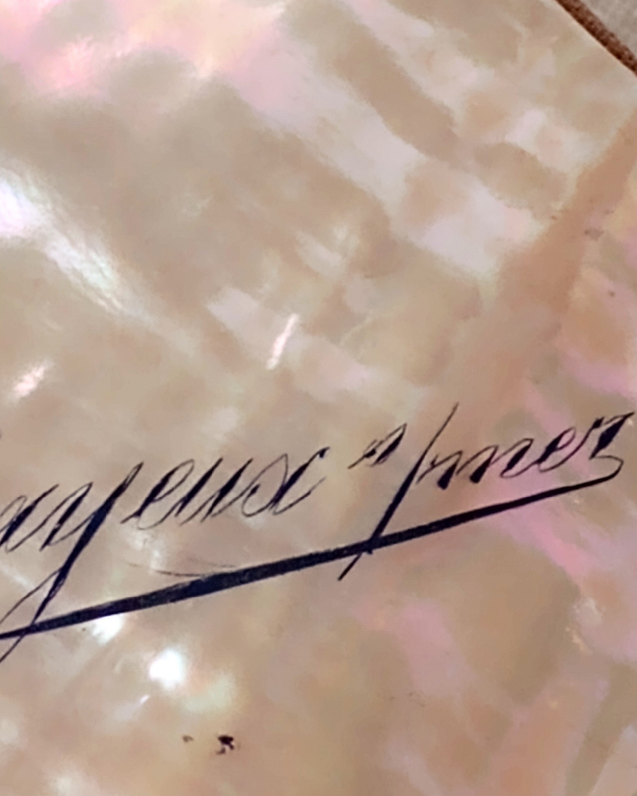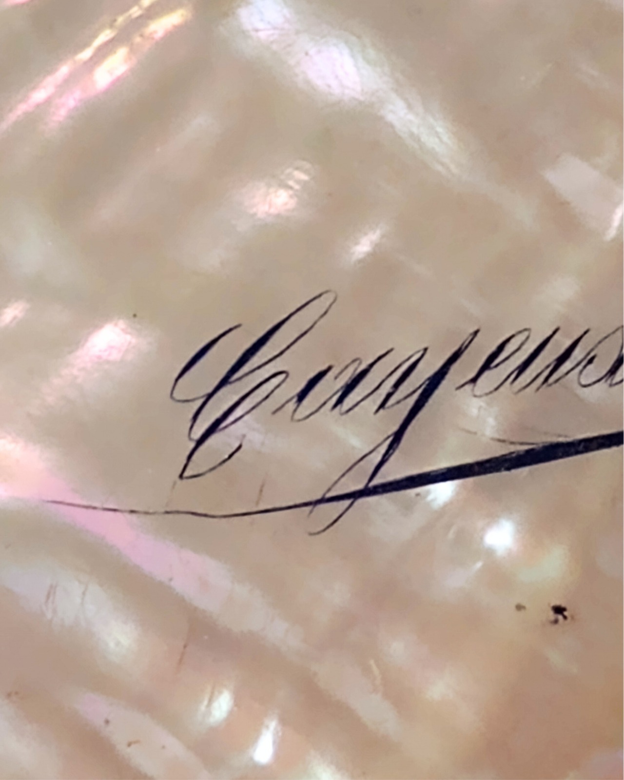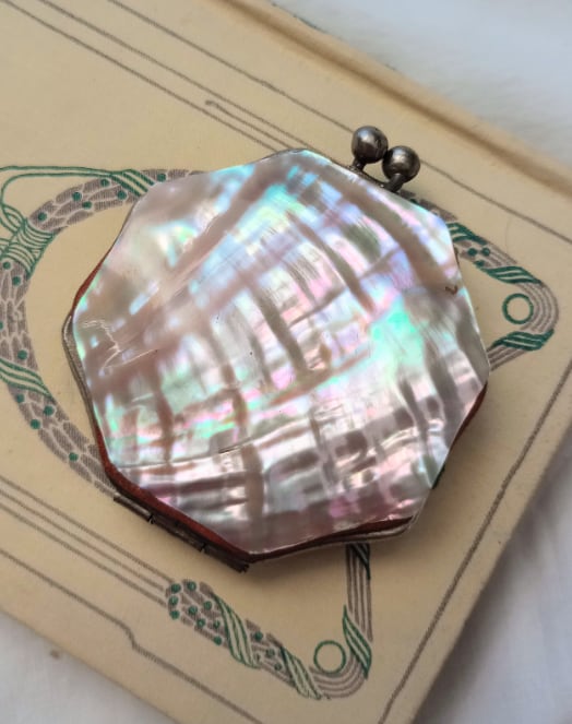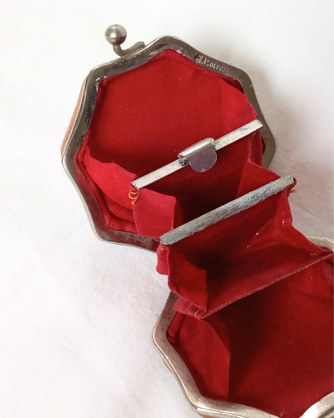 フランスより届きました、マザーオブパールのがま口(コインパース)でその昔お土産だったものです。優雅なカリグラフィーの文字が流れるように書かれています。中身の生地は赤のタイプで外側の真珠母貝の部分レアな六角形のかたちをし状態もとても良いものです。