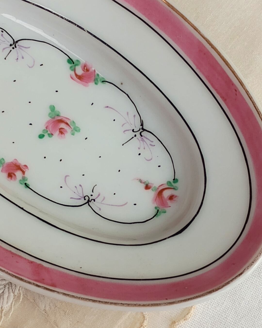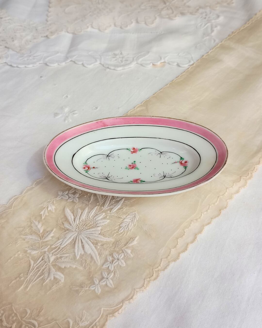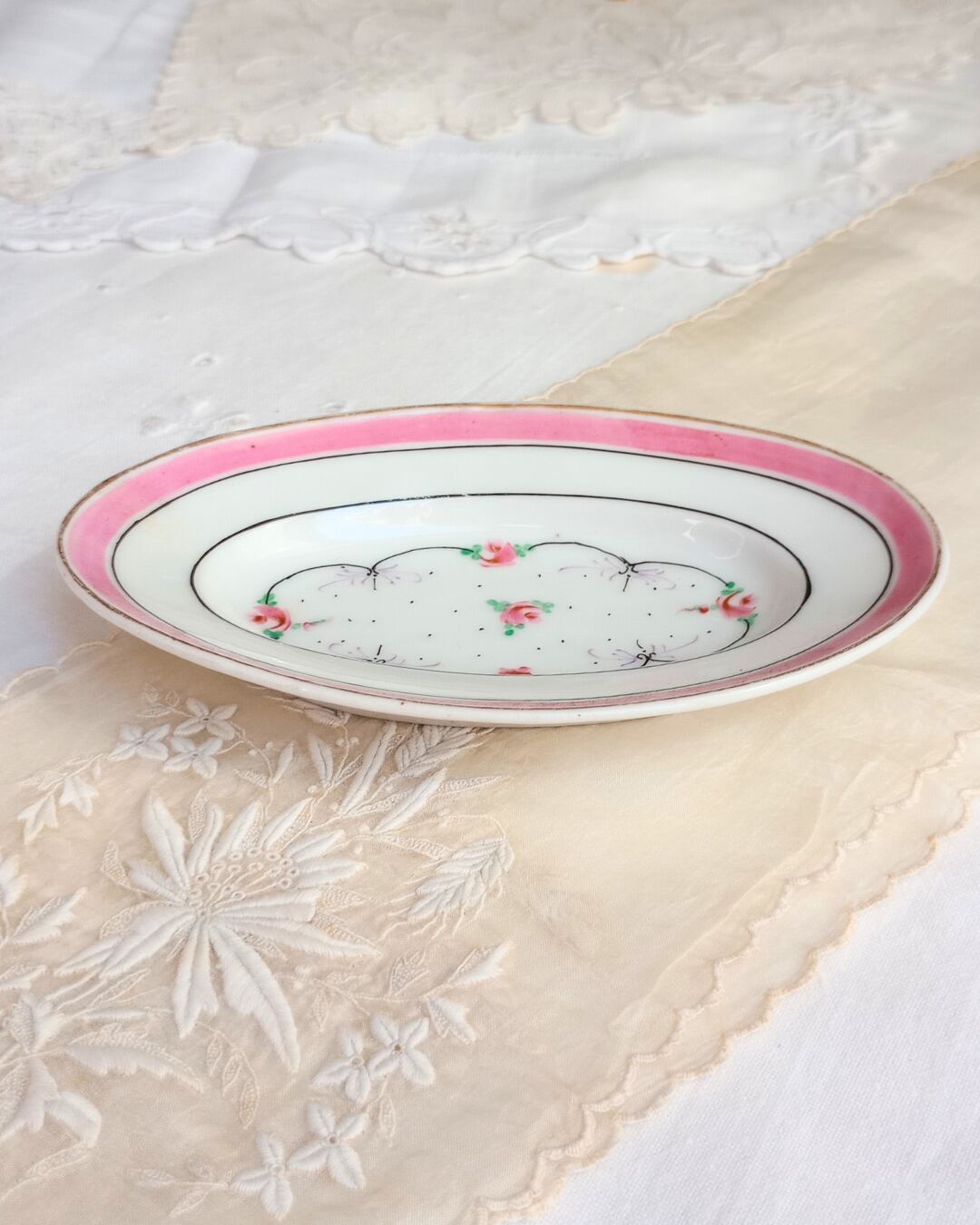 ふちどりにはピンクのライン、小さなローズのハンドペイントが愛らしいおままごとのお皿でこちらは少し深さのあるオーバルのお皿です。お菓子を入れたりアクセサリートレイなどにされても素敵です。
