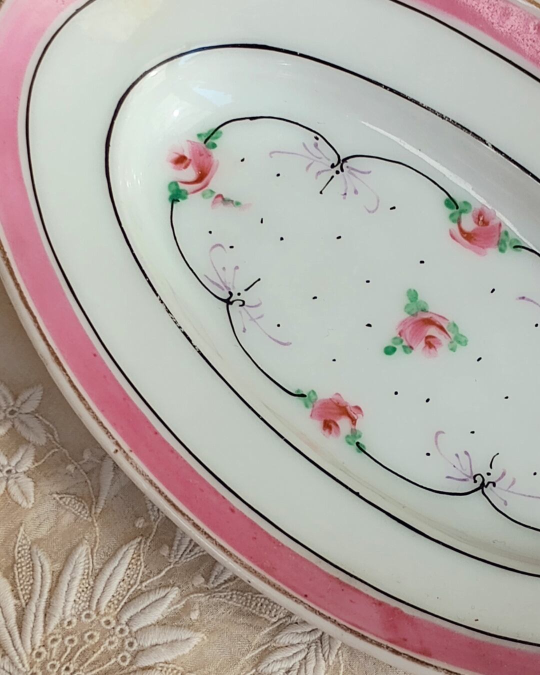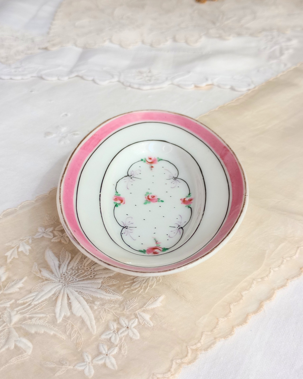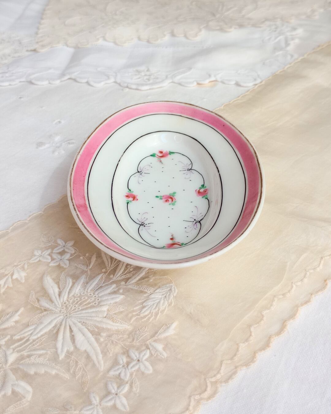 ふちどりにはピンクのライン、小さなローズのハンドペイントが愛らしいおままごとのお皿でこちらは少し深さのあるオーバルのお皿です。お菓子を入れたりアクセサリートレイなどにされても素敵です。