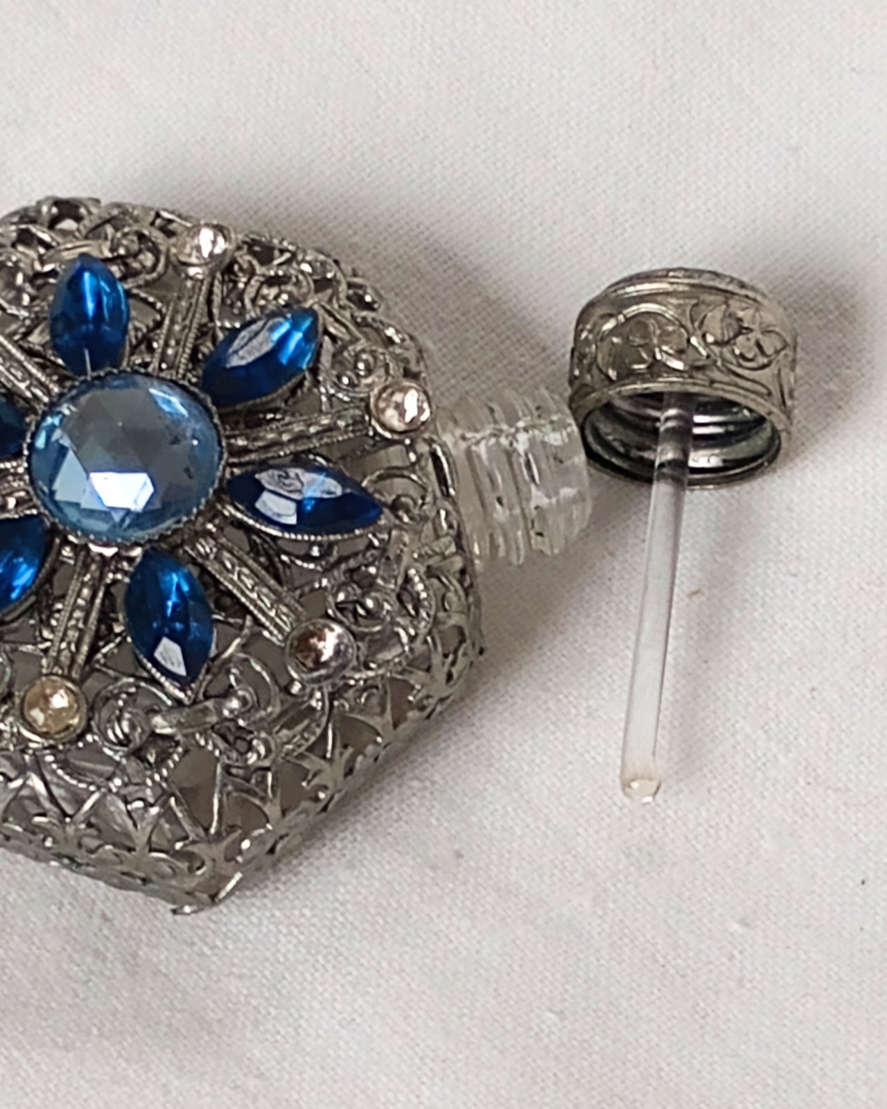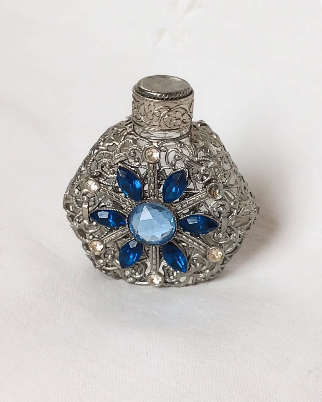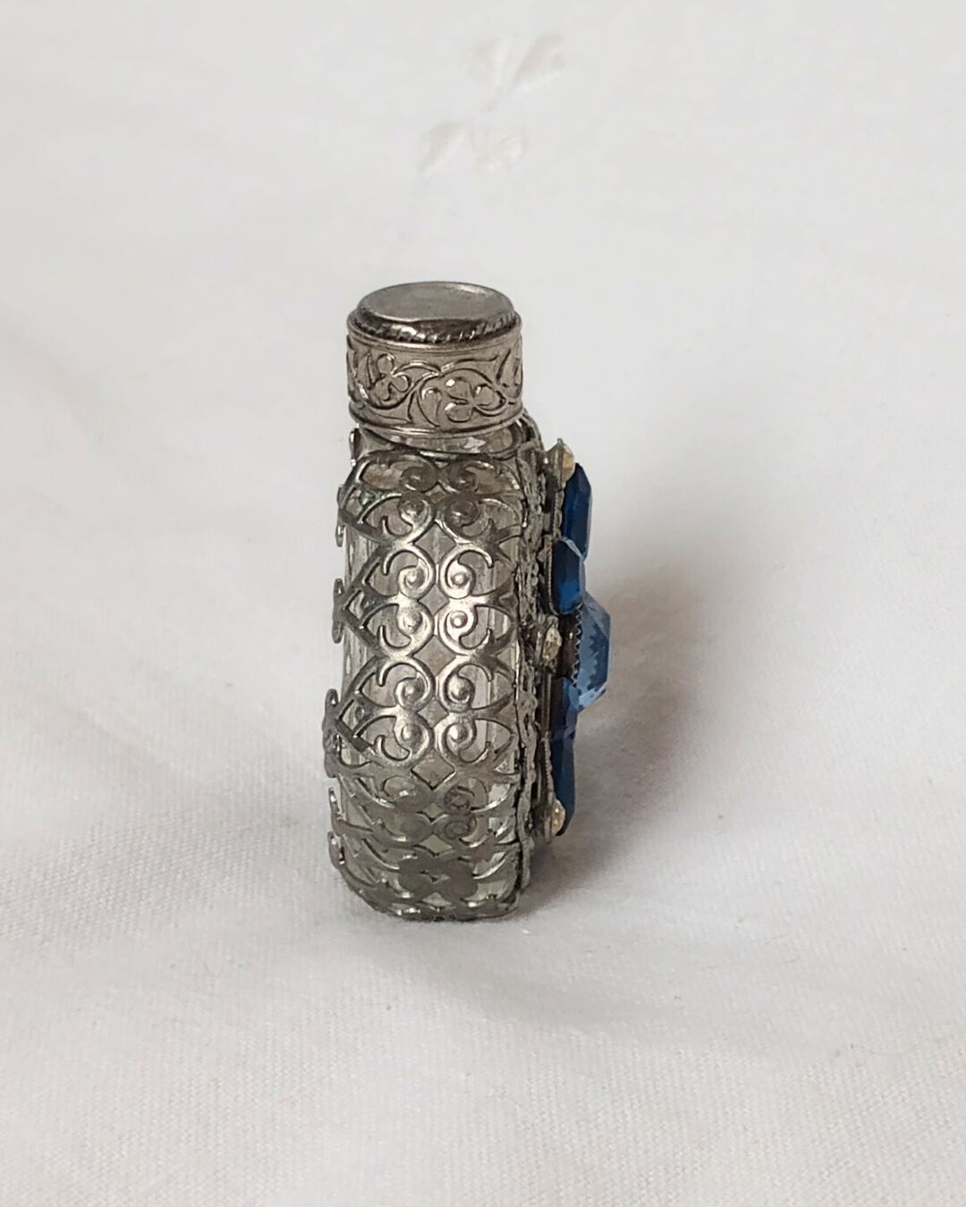 フランスより届きました、シルバーメッキの繊細な編み目の装飾がガラスに施されたヴィンテージの古い香水ボトル、1980年頃のお品です。シルバーカラーに入った水色と青のビジューの組み合わせがとても素敵です。