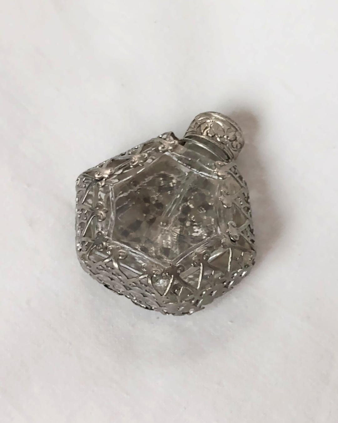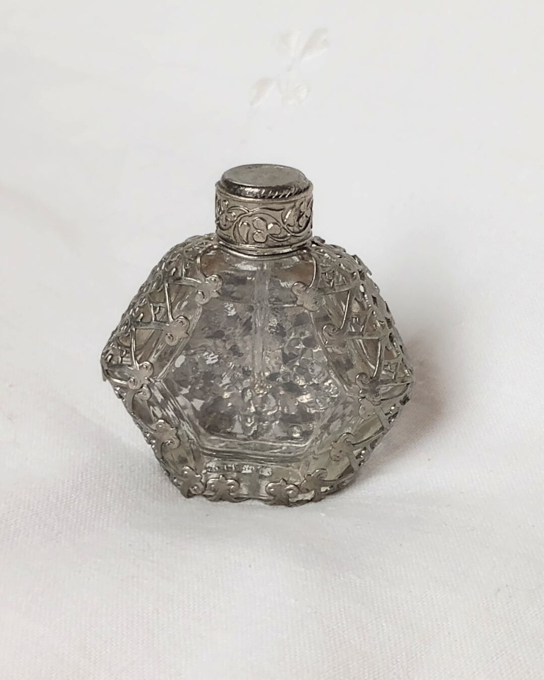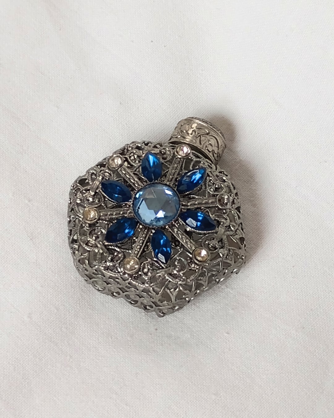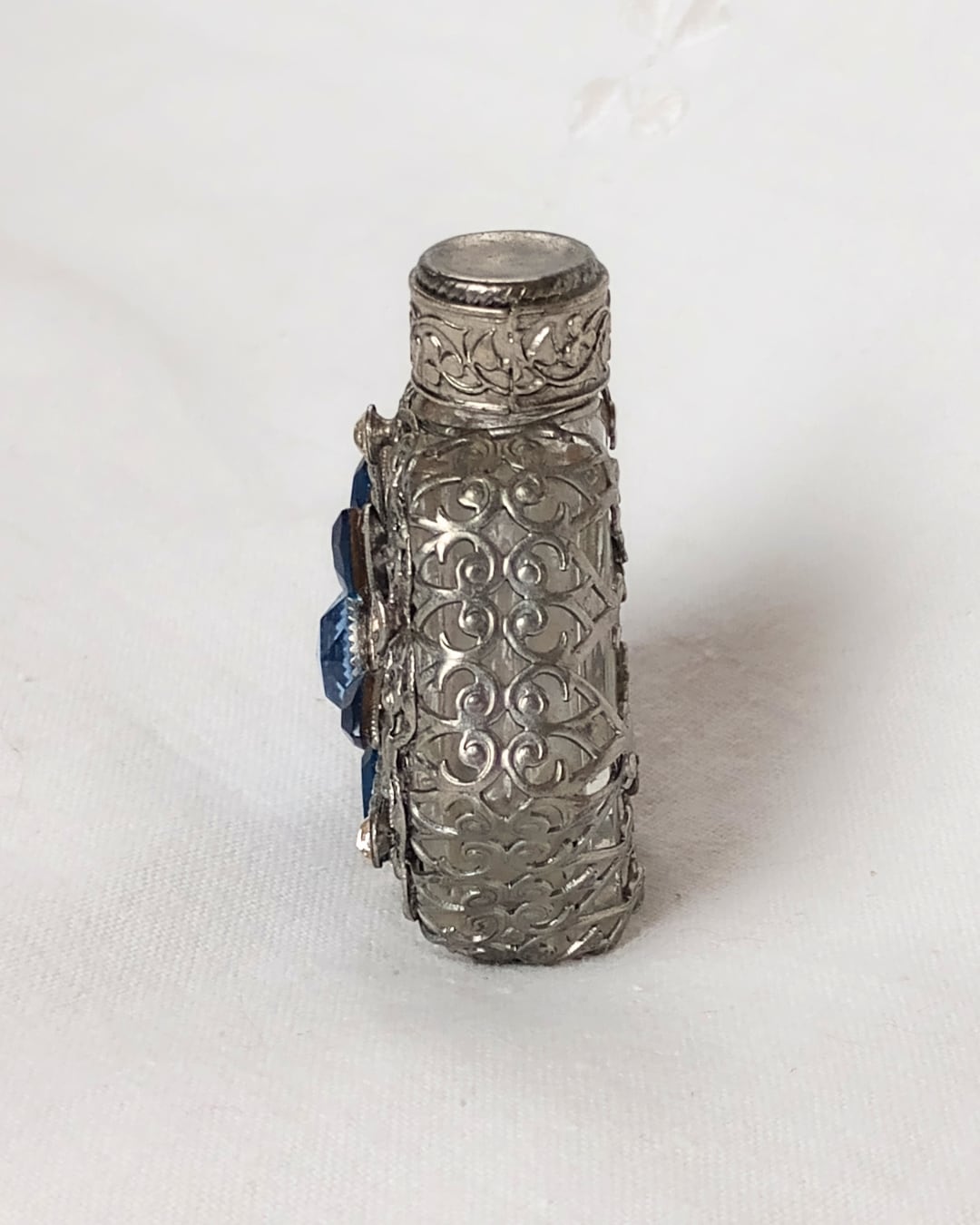フランスより届きました、シルバーメッキの繊細な編み目の装飾がガラスに施されたヴィンテージの古い香水ボトル、1980年頃のお品です。シルバーカラーに入った水色と青のビジューの組み合わせがとても素敵です。