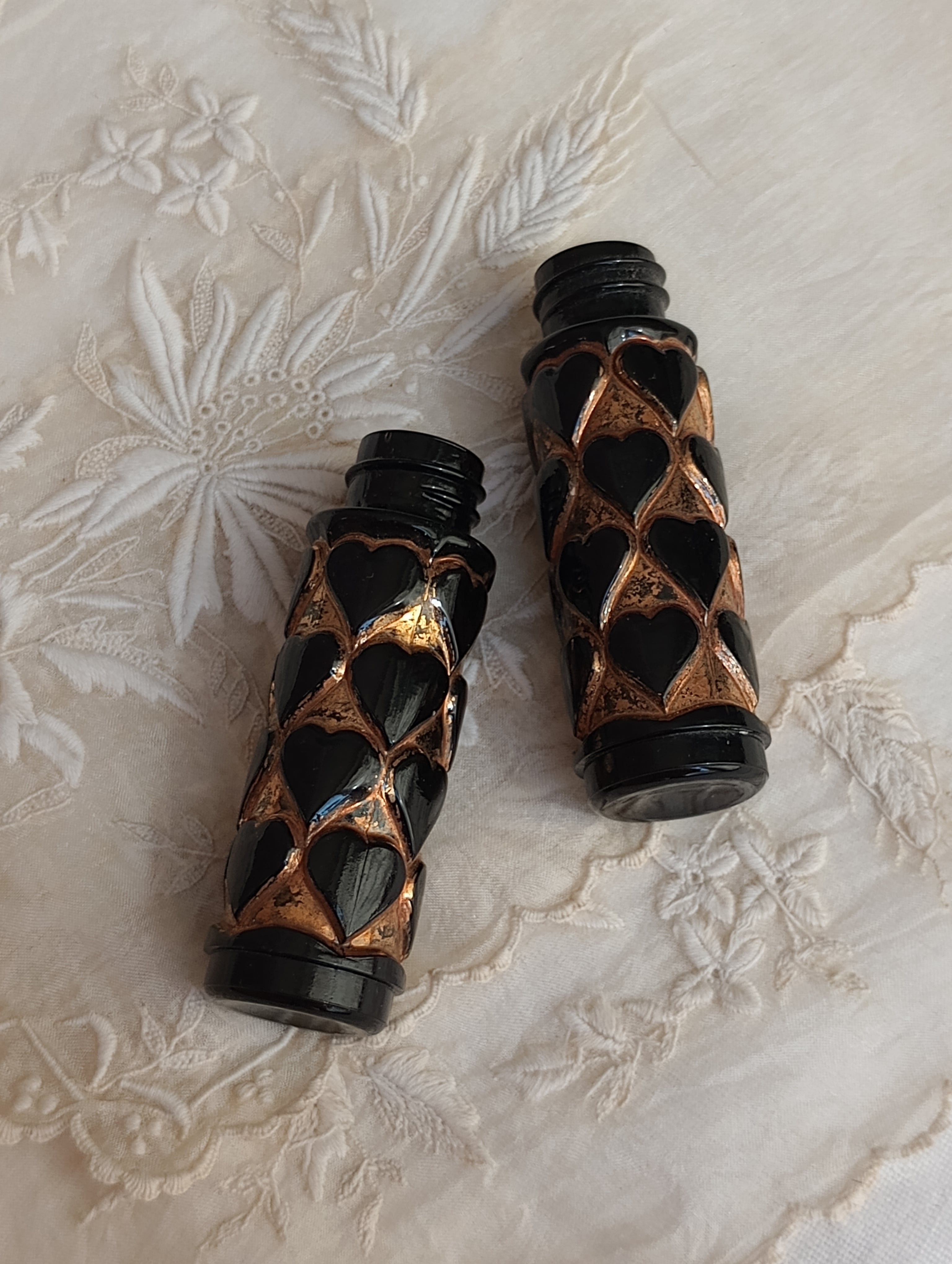 フランスより届きました、古い小さな黒のガラスの香水ボトル。ゴールドの着彩で浮きでたハートがとっても素敵。並べて立てて飾られても、小さな植物やお花を入れても可愛いと思います。
