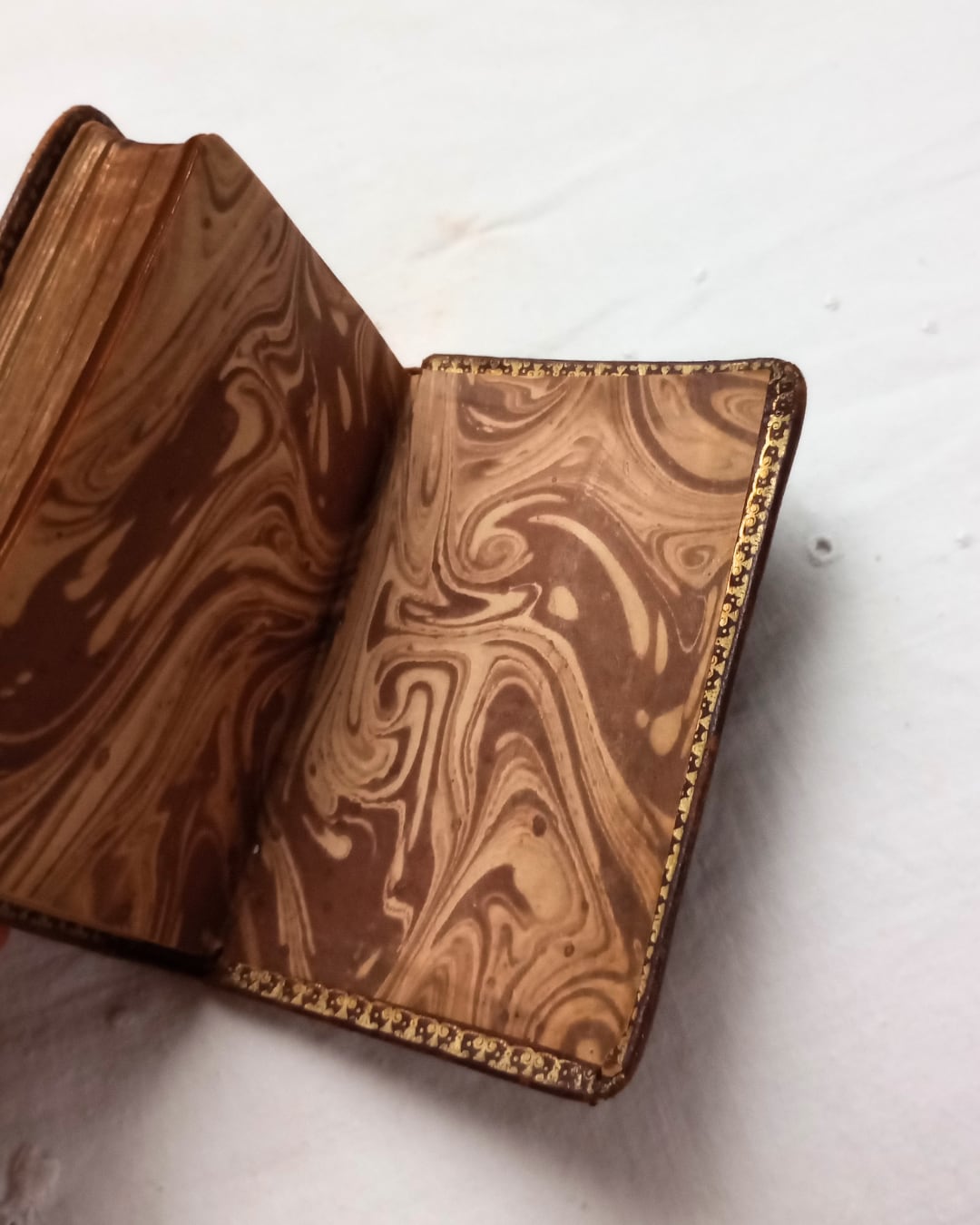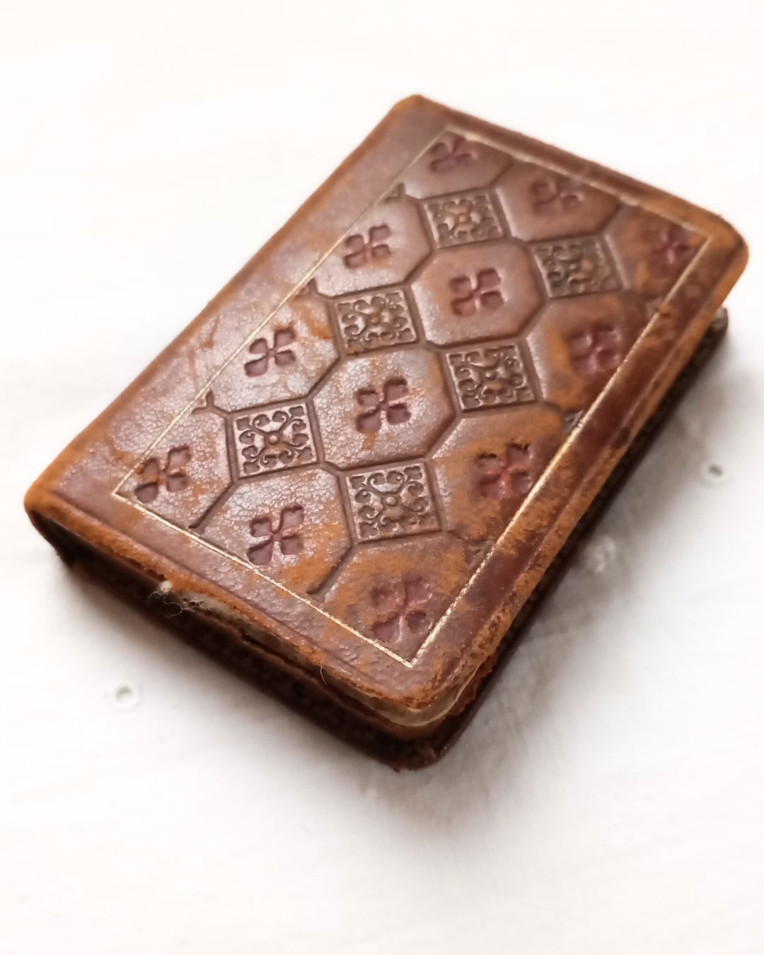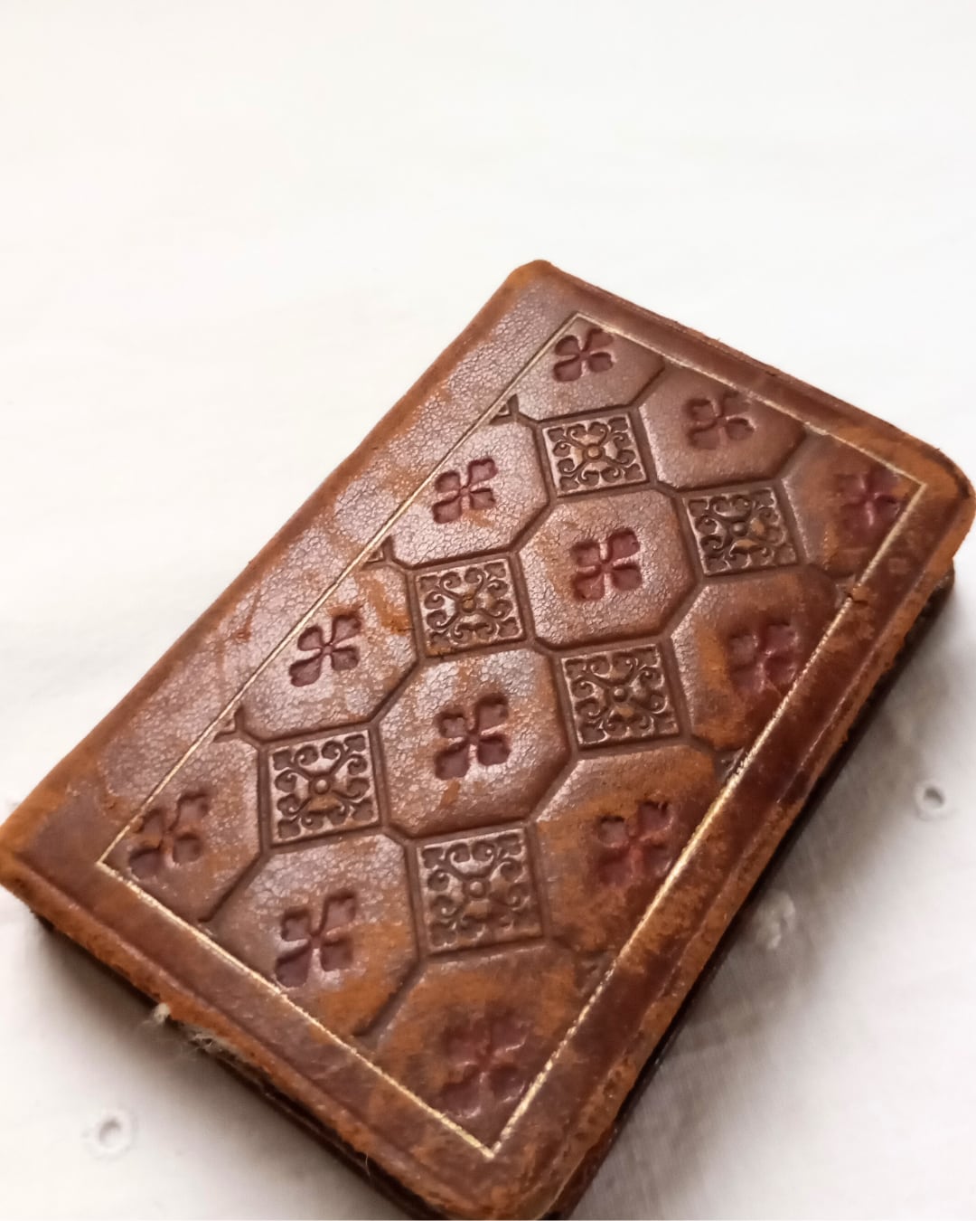 片手にすっと収まるサイズのふっくらとした革の表紙、型押しされたタイルの様な模様がとても素敵です。小口部分にも金彩がほどこされ見返しページには茶系のマーブリングの紙が使われております。