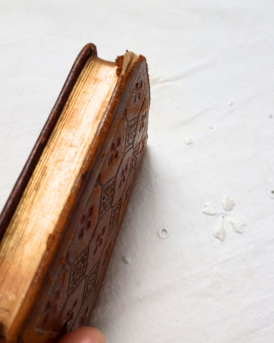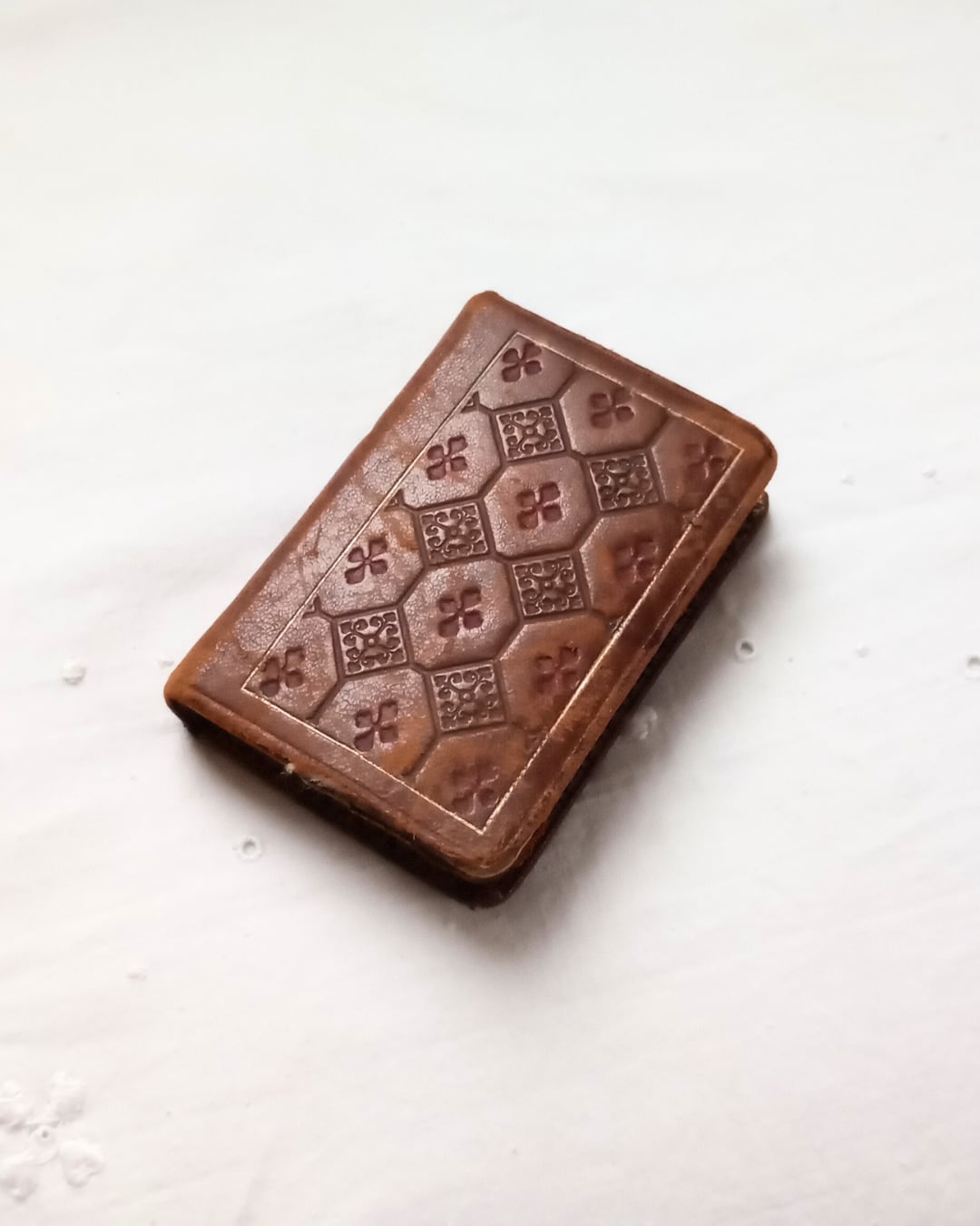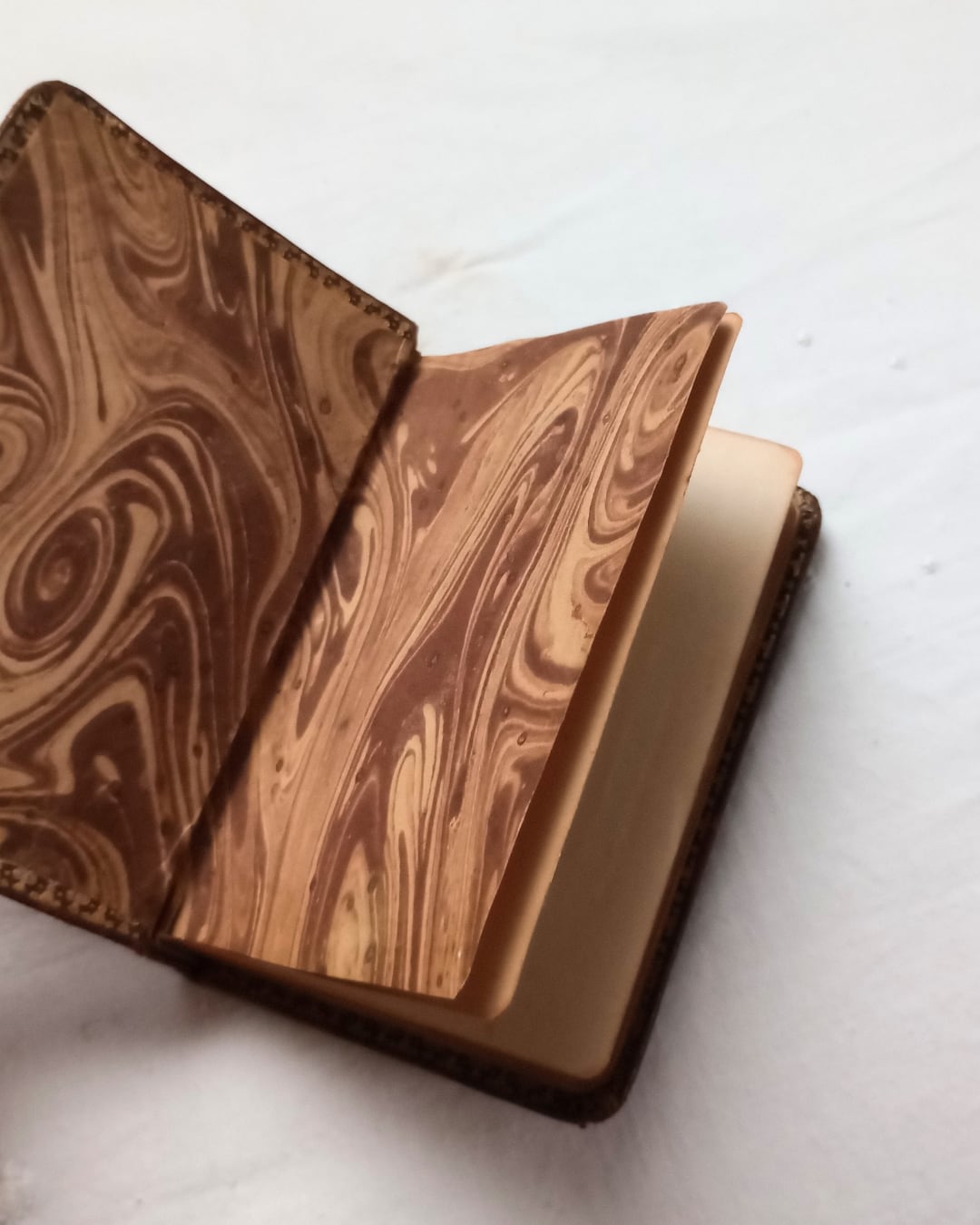 片手にすっと収まるサイズのふっくらとした革の表紙、型押しされたタイルの様な模様がとても素敵です。小口部分にも金彩がほどこされ見返しページには茶系のマーブリングの紙が使われております。