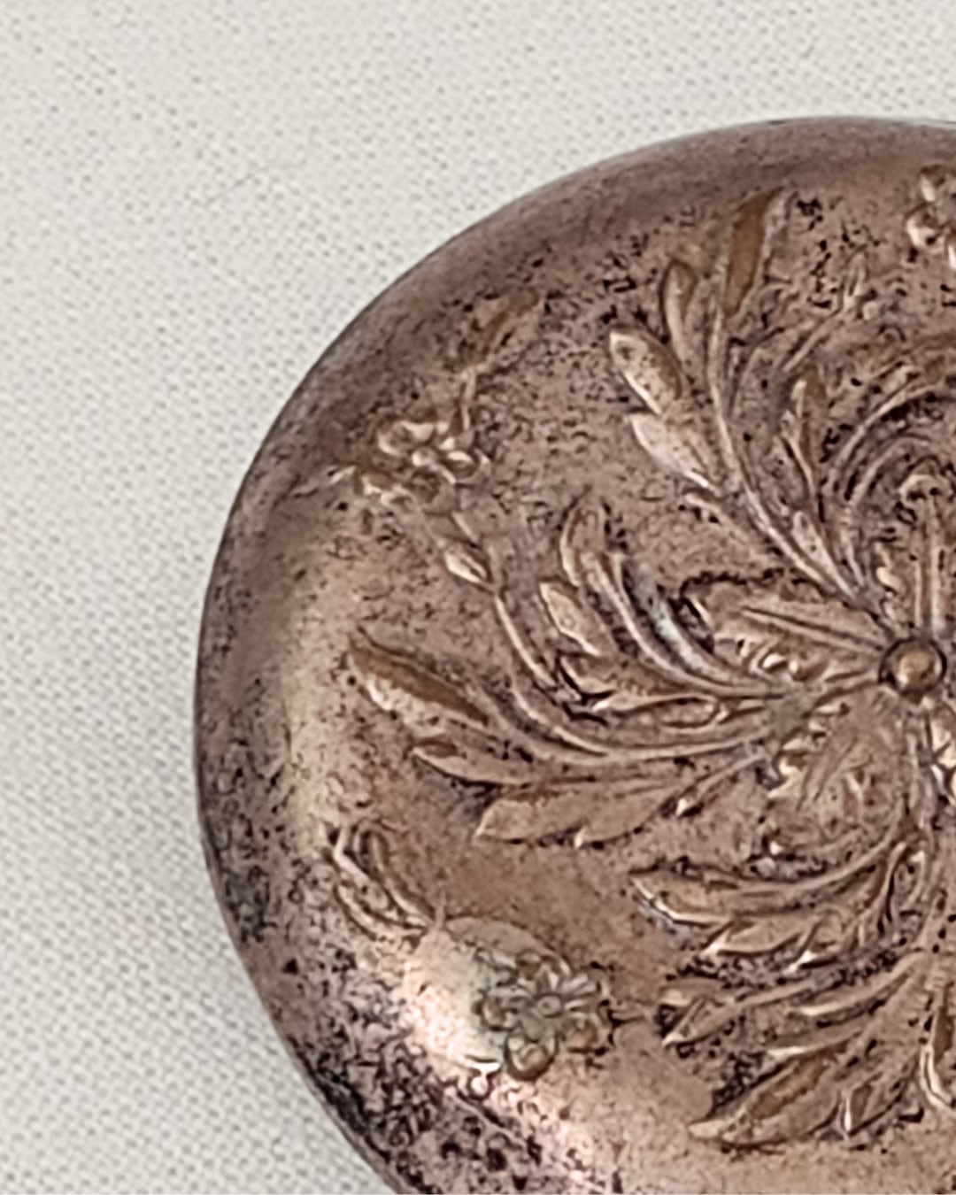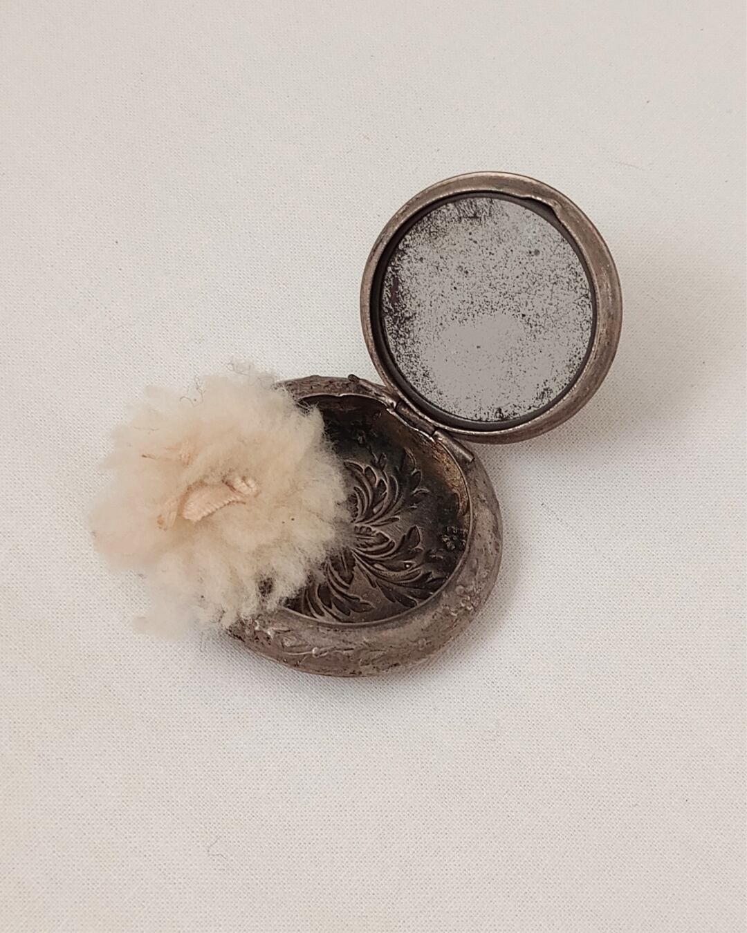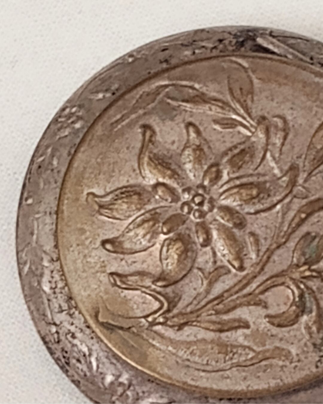 フランスより届きました、古い小さな鏡のついたシルバープレート製パウダーケースです。エーデルワイスのお花のエンボス装飾のもので直径が約4.5cmのタイプです。中にはボソボソした質感の当時のパフがついています。