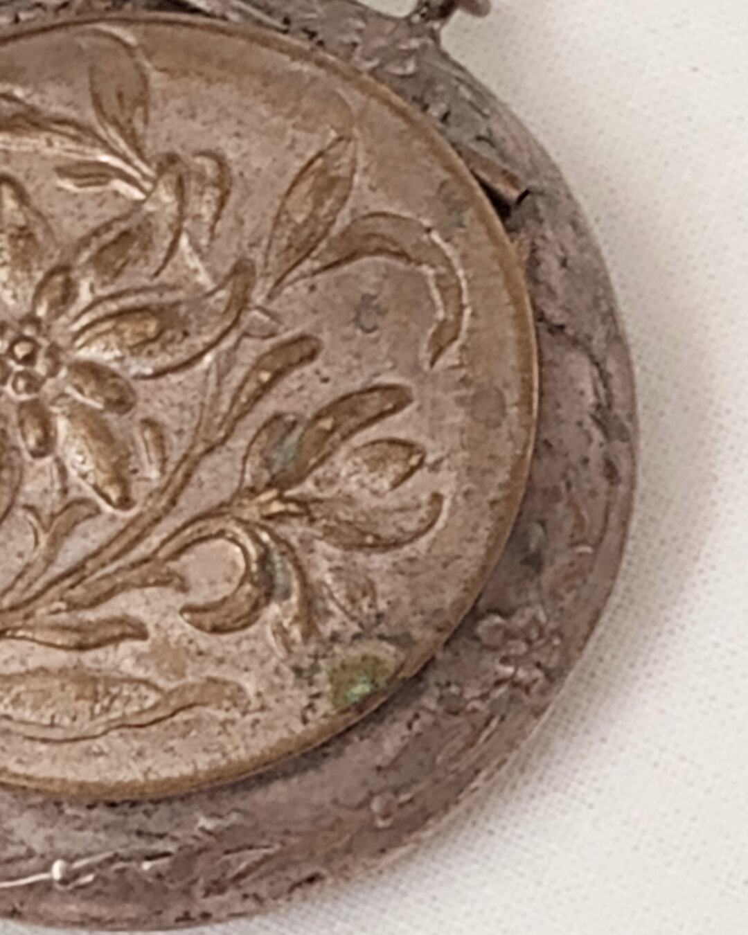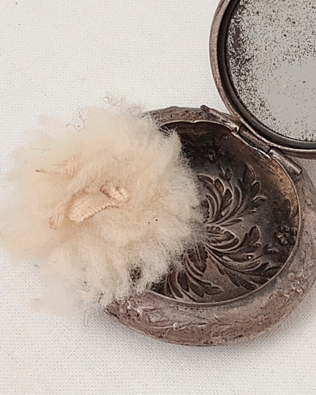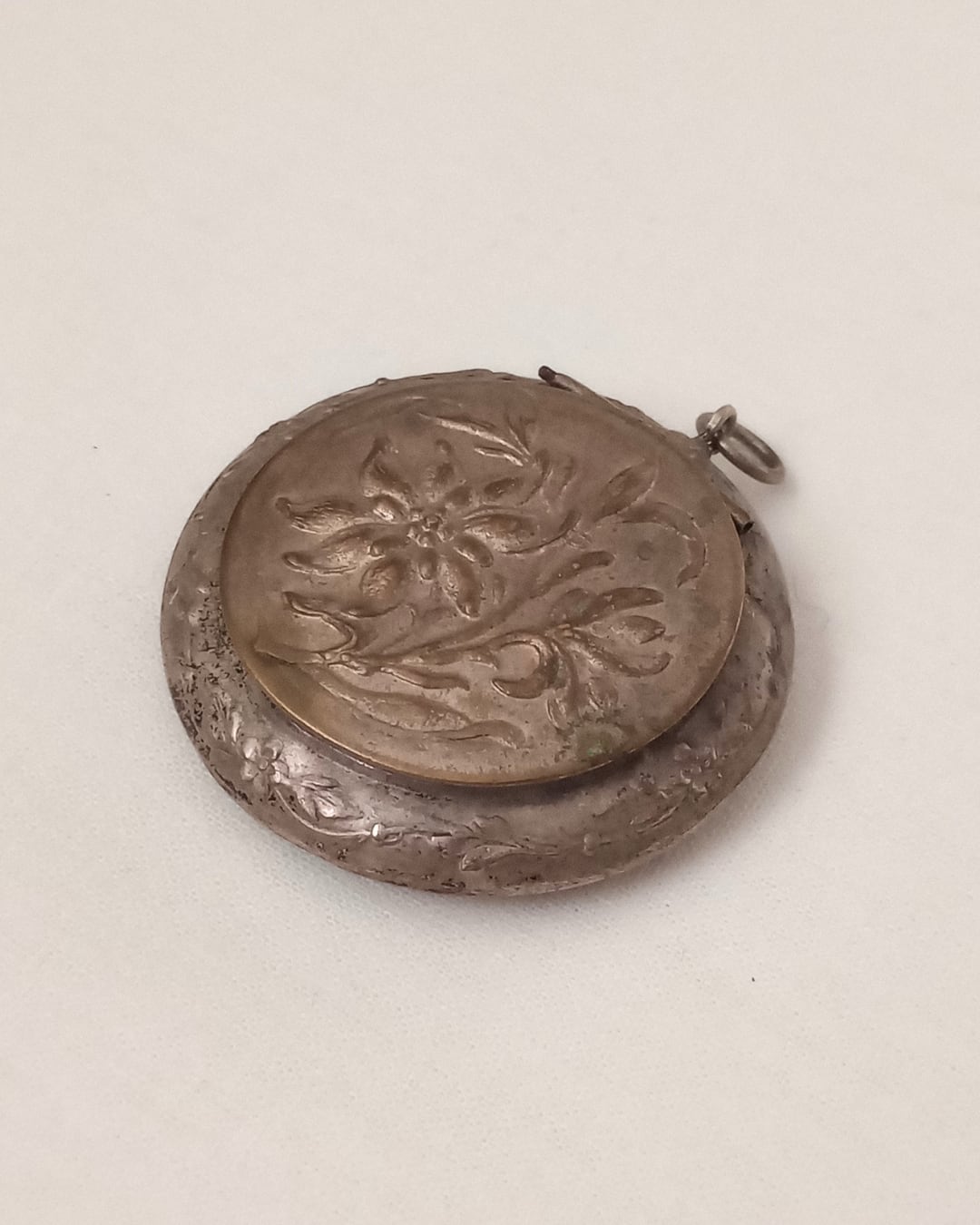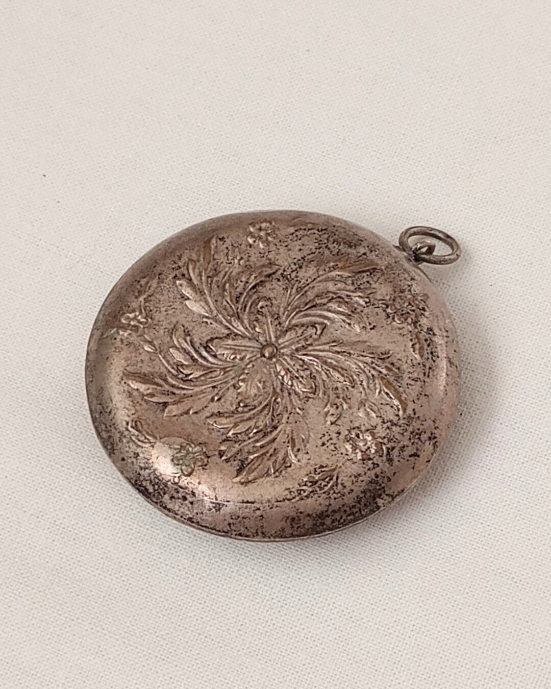 フランスより届きました、古い小さな鏡のついたシルバープレート製パウダーケースです。エーデルワイスのお花のエンボス装飾のもので直径が約4.5cmのタイプです。中にはボソボソした質感の当時のパフがついています。