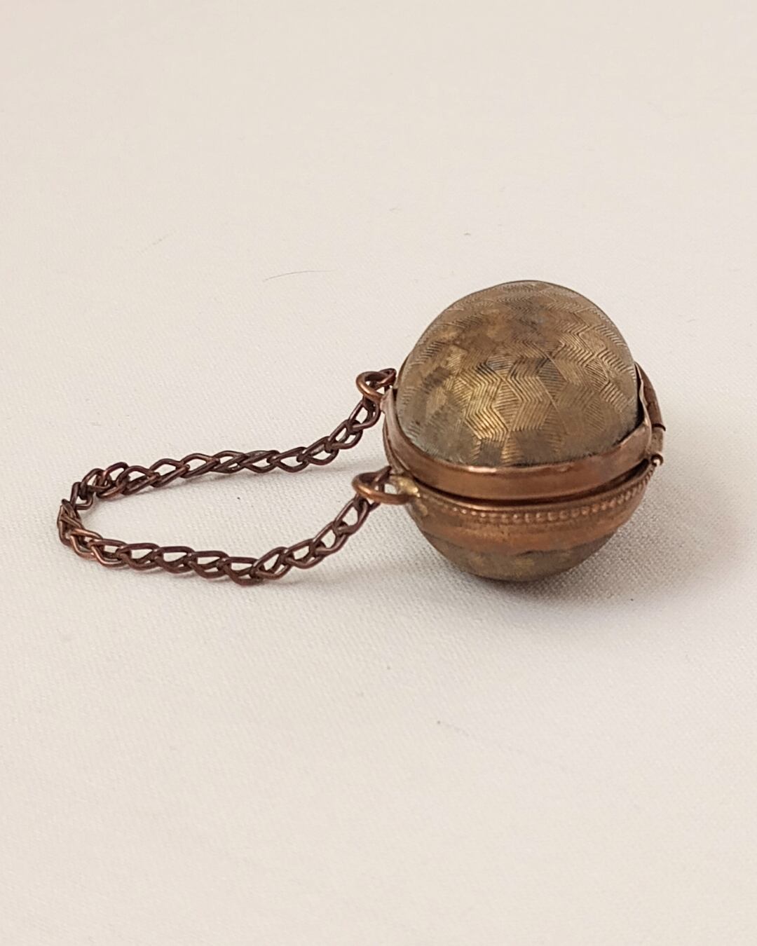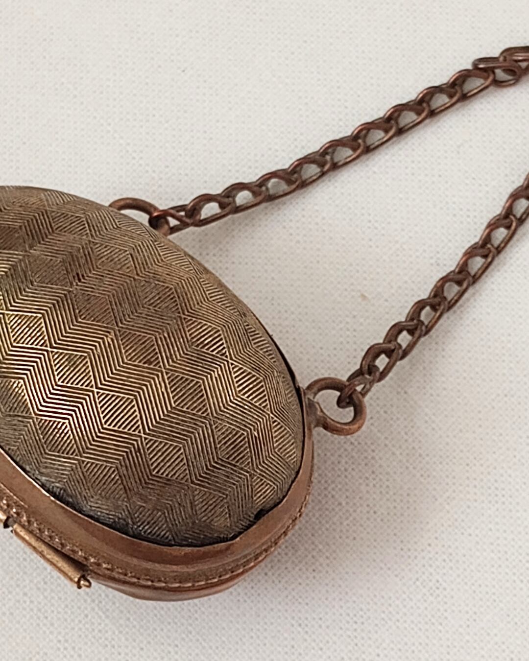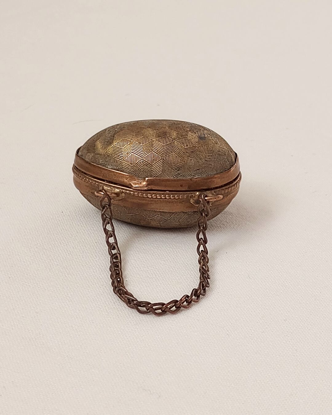 フランスより届きましたナポレオン三世様式の真鍮の小さな卵型のケースです。ロザリオのケースとして使われていたもののようです。飾ることはもちろん、チェーンがついておりますので小さなお人形のバッグとしてもご活用できるコレクターズアイテムです。
