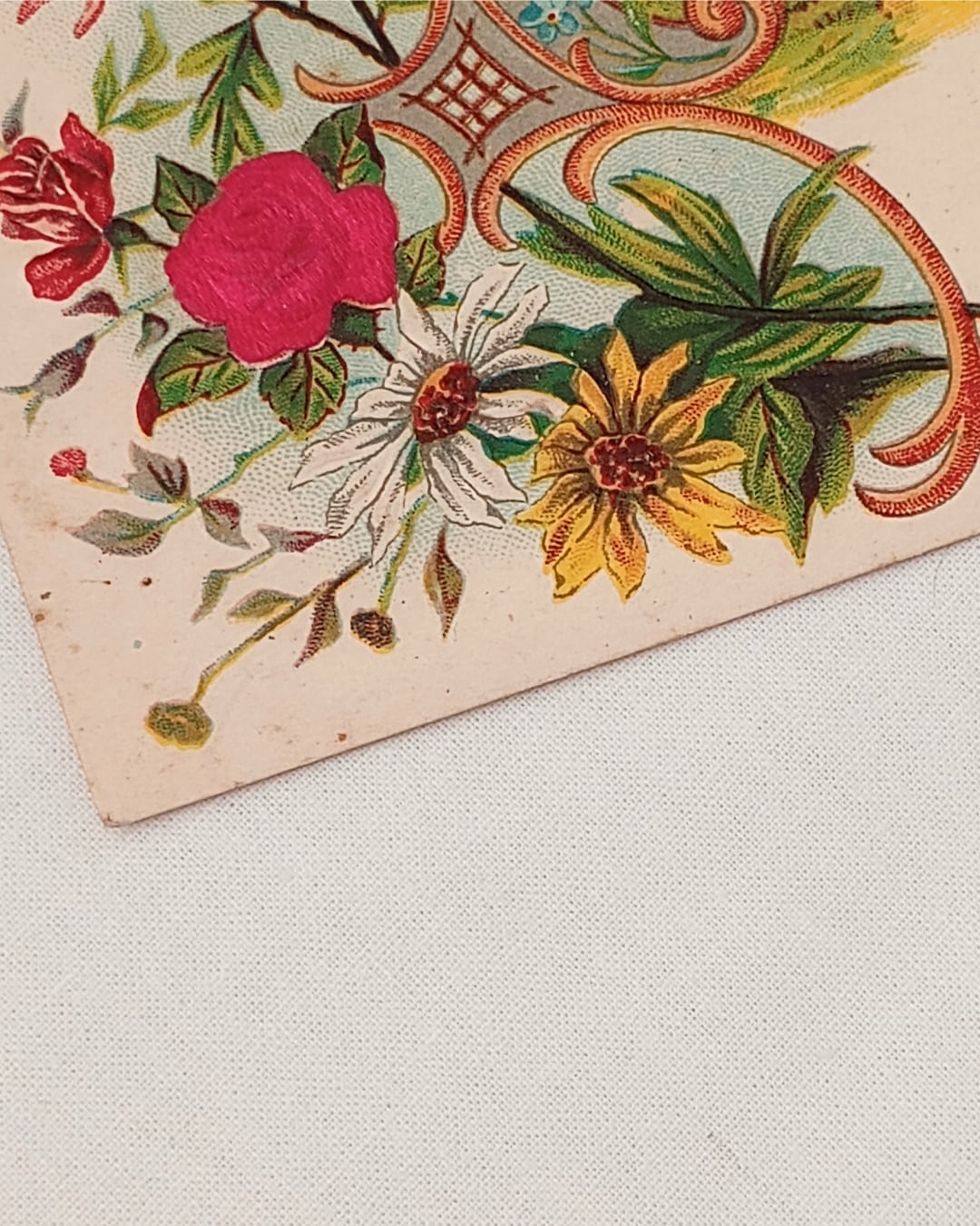 旅行先から送られたものでしょうか、幸福を願うカードの様ですカラフルに彩られたお花はエンボス加工で、エーデルワイスやローズが描かれております。