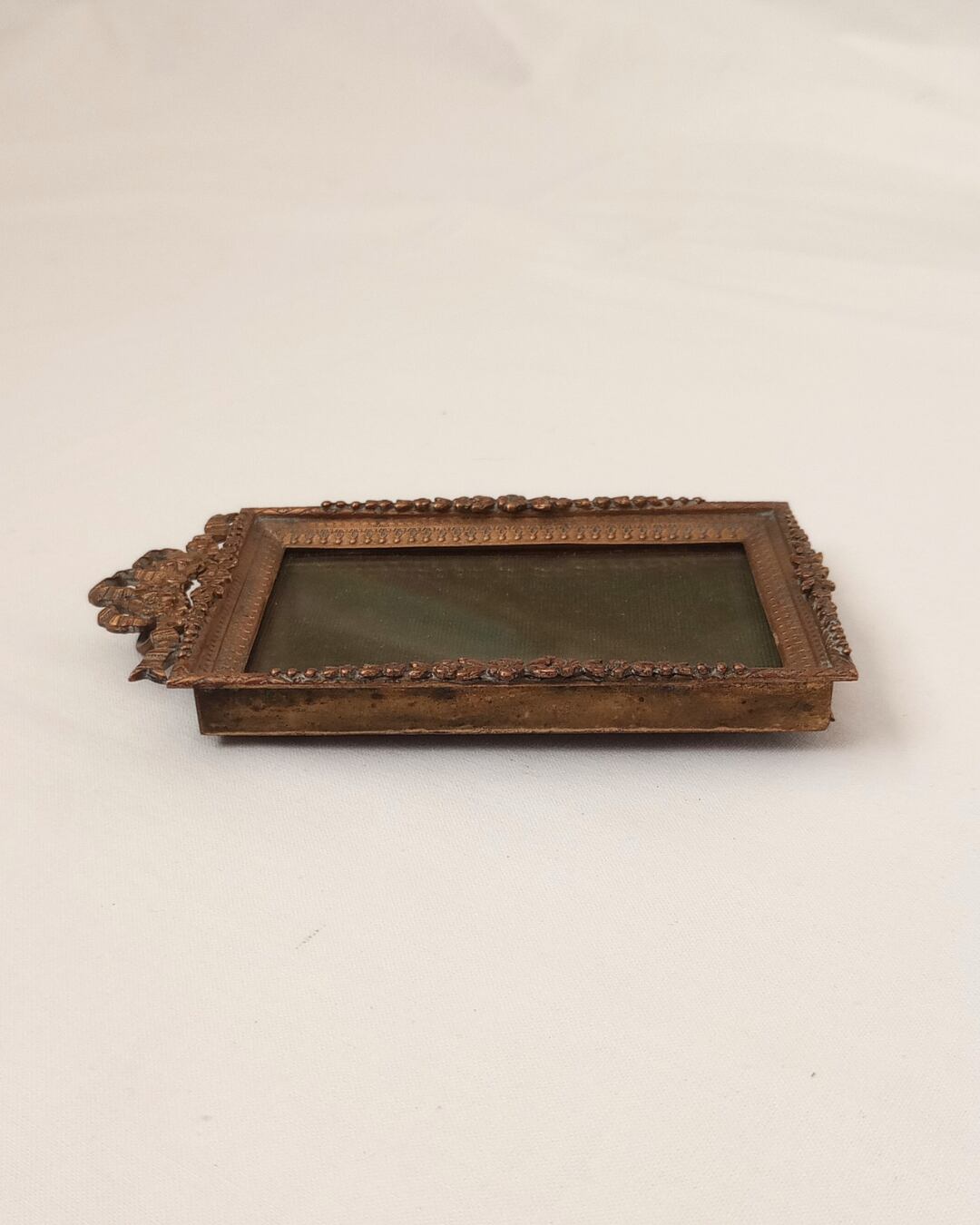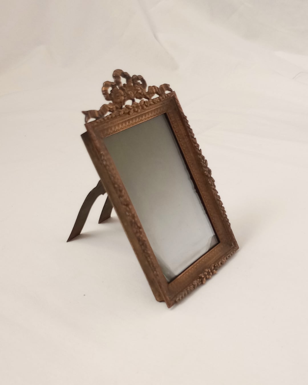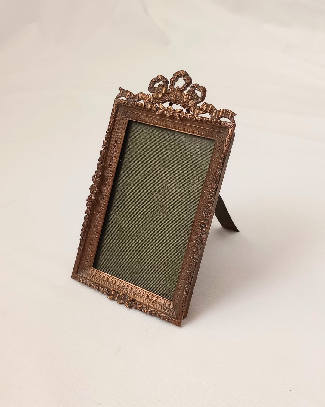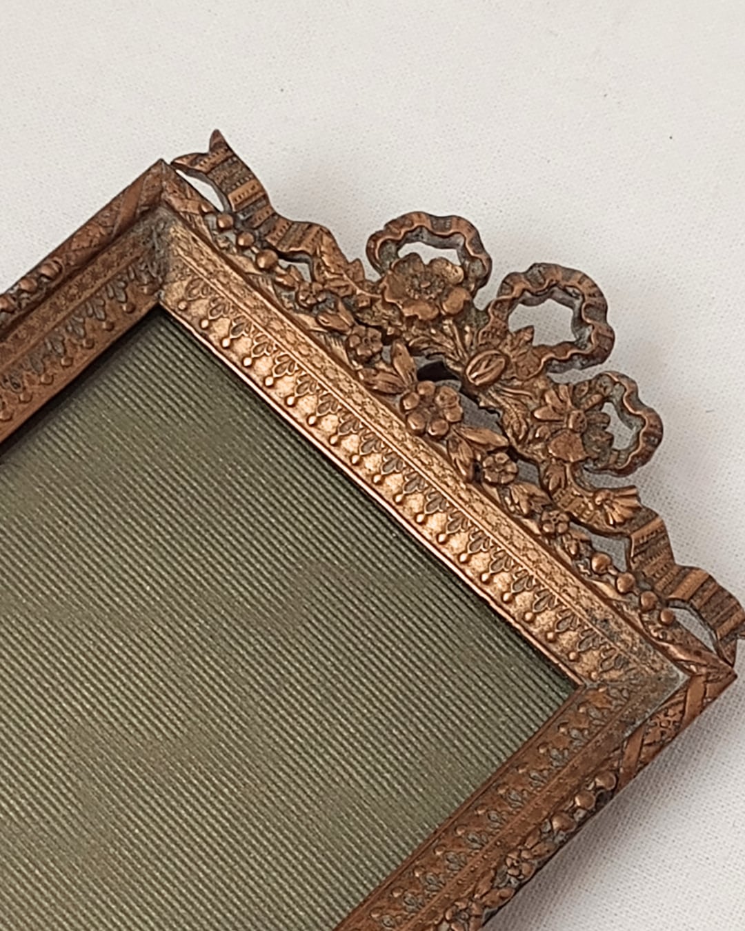 フランスより届きましたリボンのオルモル装飾が素敵なフォトフレームです。1900年代初期頃までのお品物でオルモル装飾のリボンやお花がとても手のこんだものです。フレームの上下左右4面のふちにも小花があしらわれた素敵なデザインです。