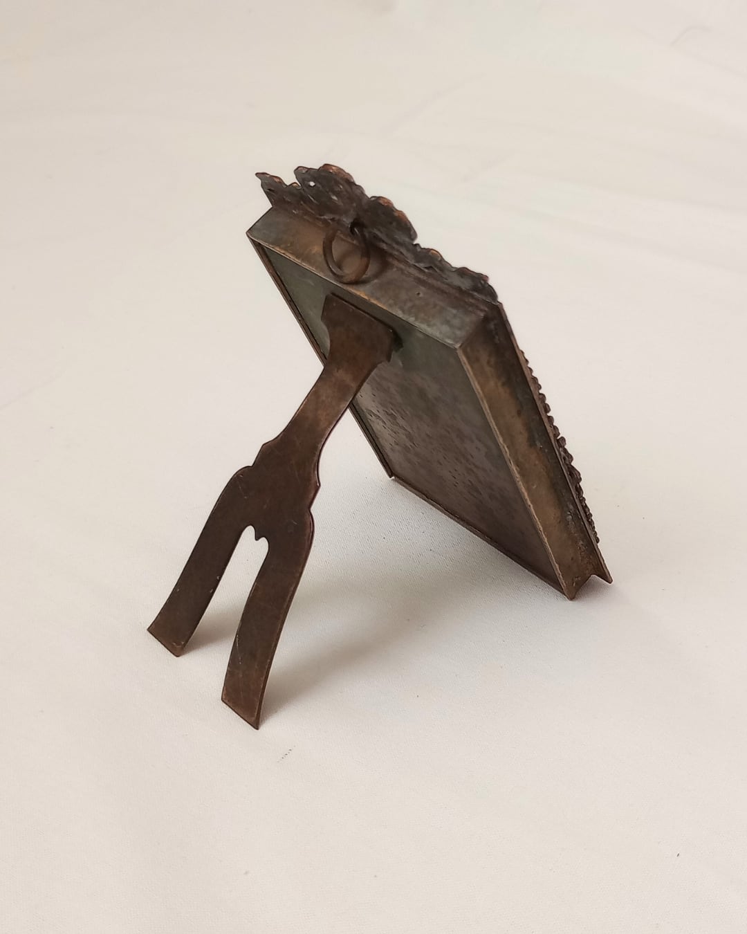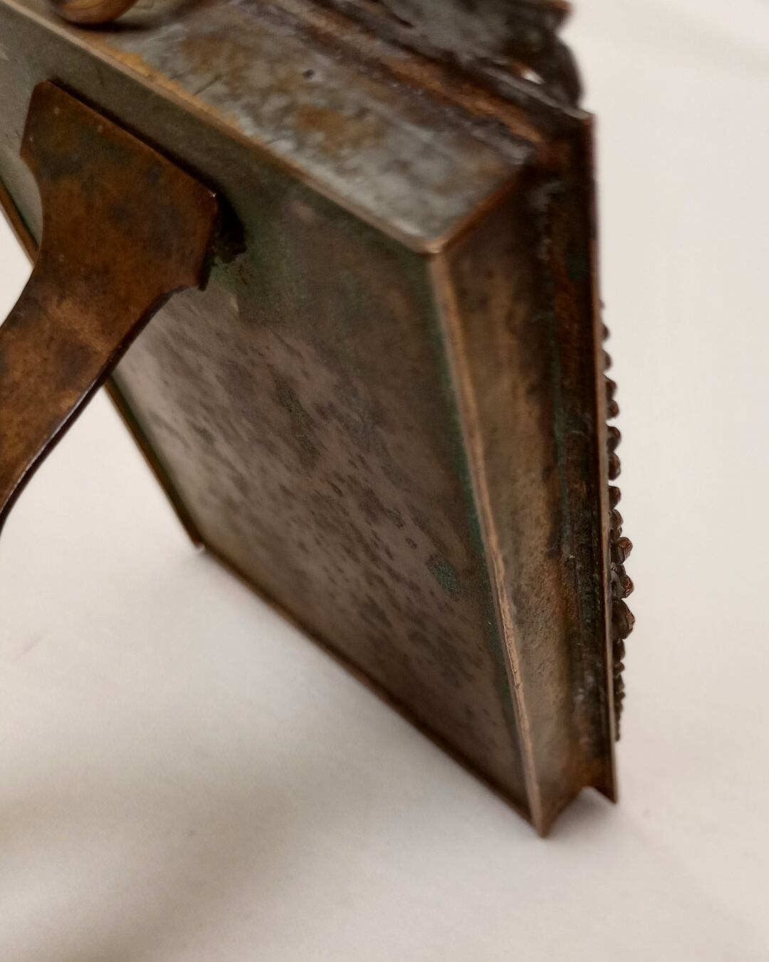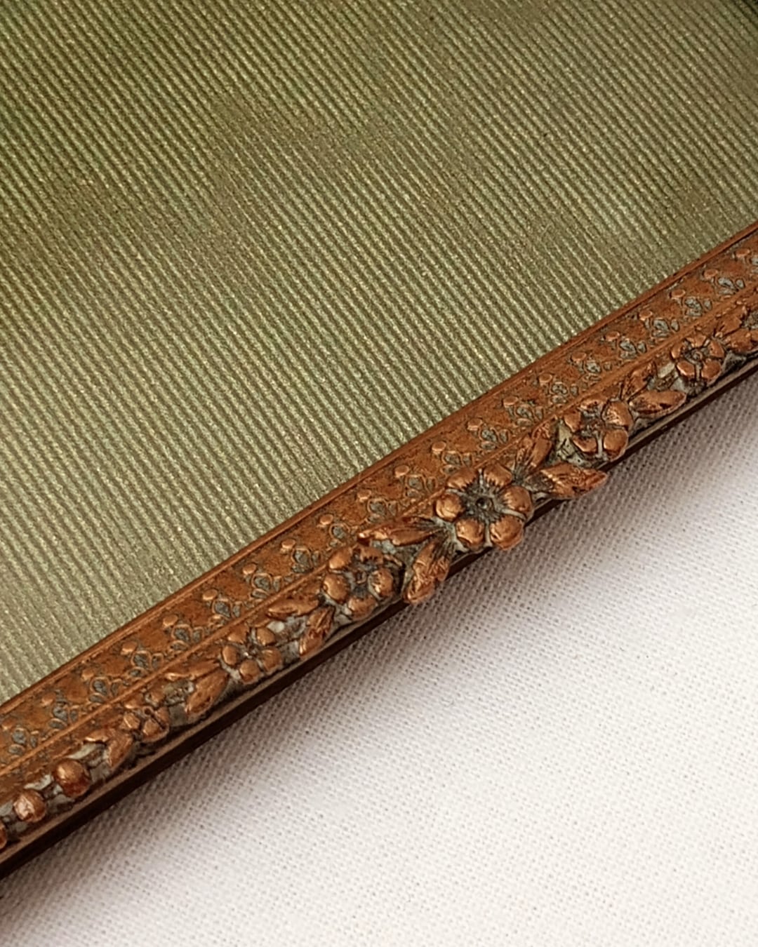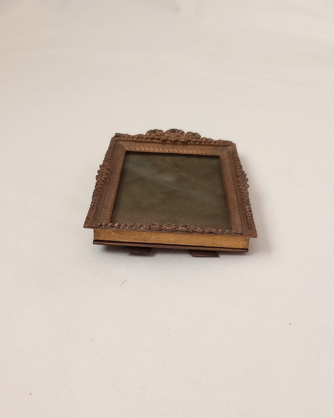 フランスより届きましたリボンのオルモル装飾が素敵なフォトフレームです。1900年代初期頃までのお品物でオルモル装飾のリボンやお花がとても手のこんだものです。フレームの上下左右4面のふちにも小花があしらわれた素敵なデザインです。