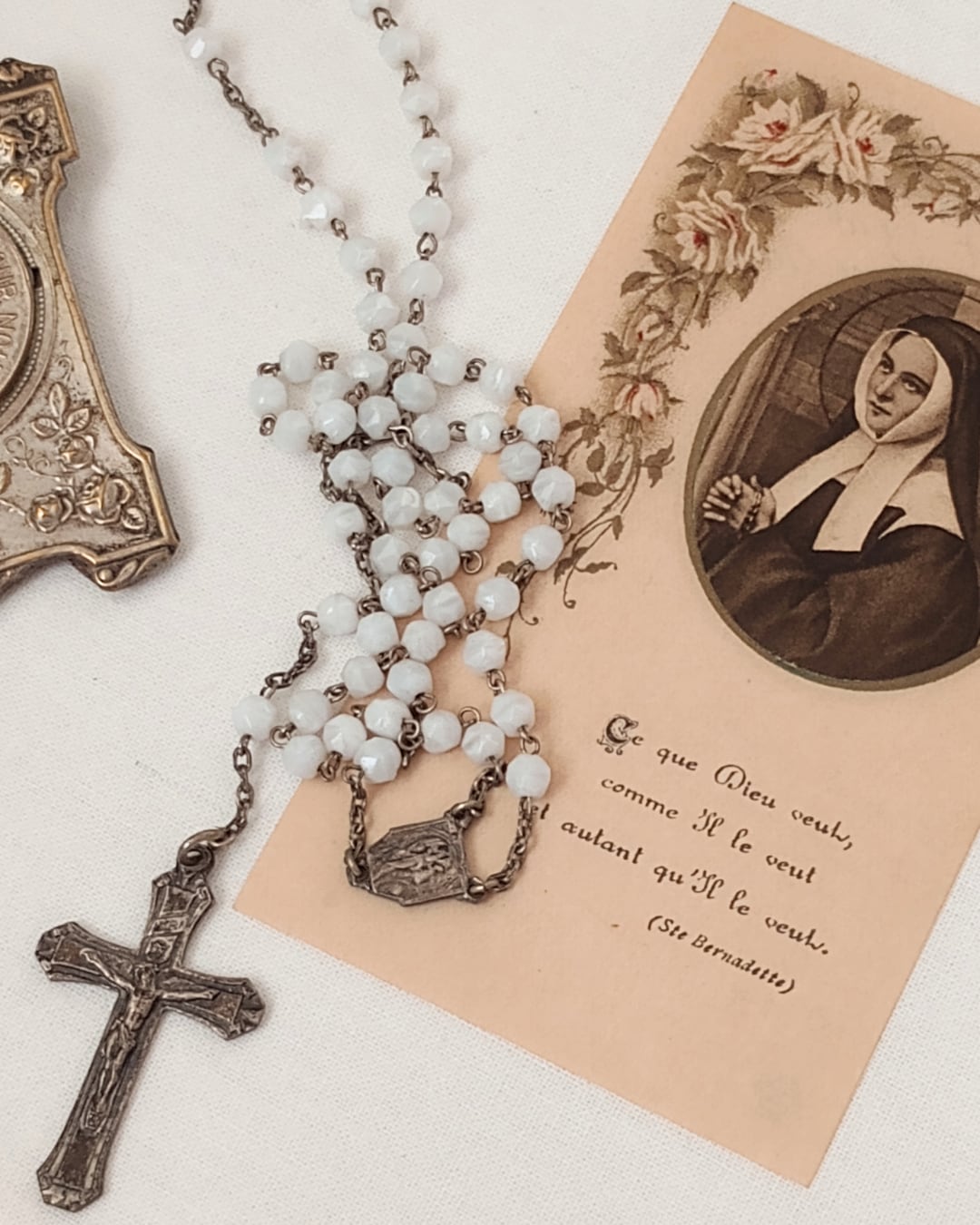 白の小さなロザリオはグラスビーズのようで多面体のカットが素敵です。