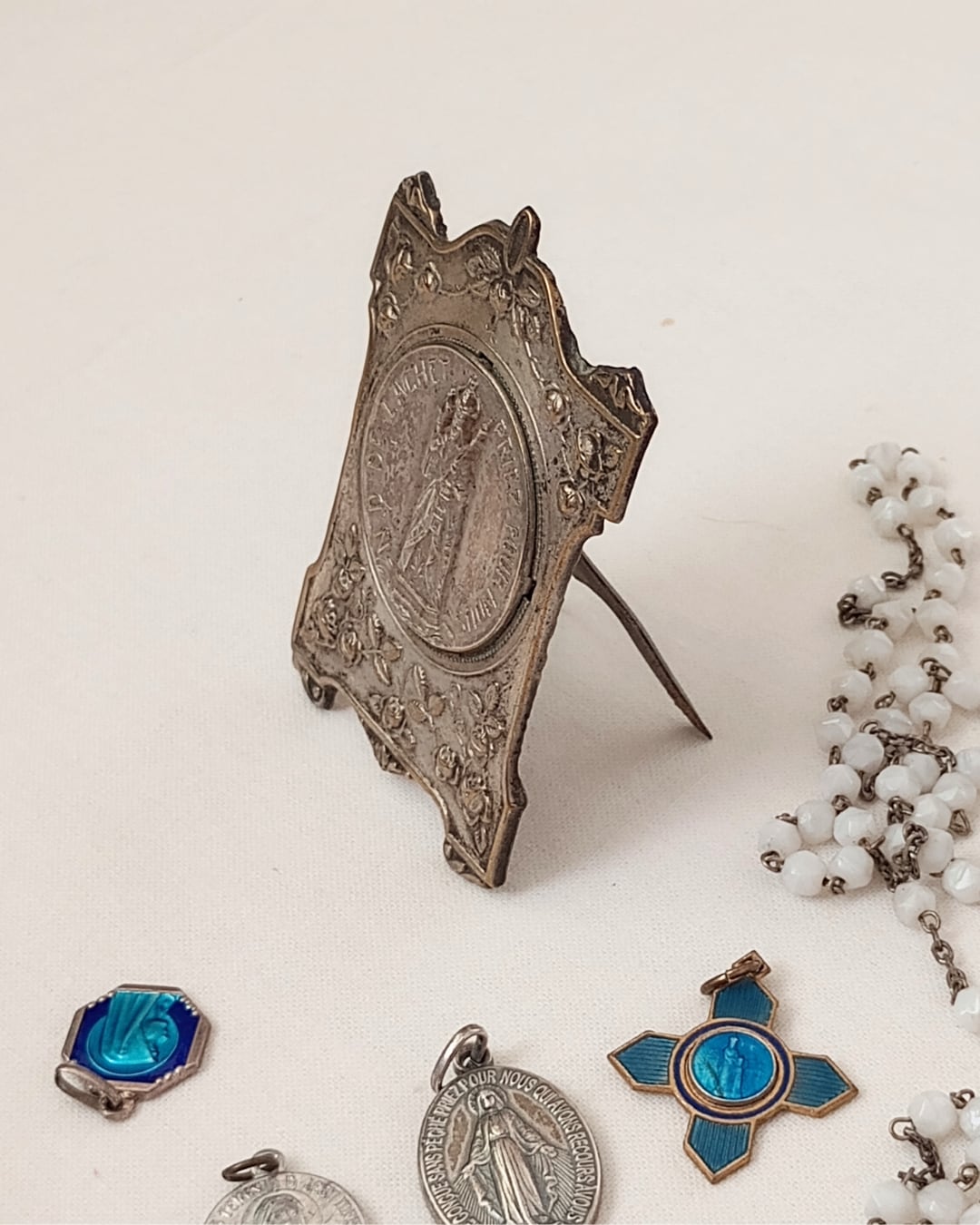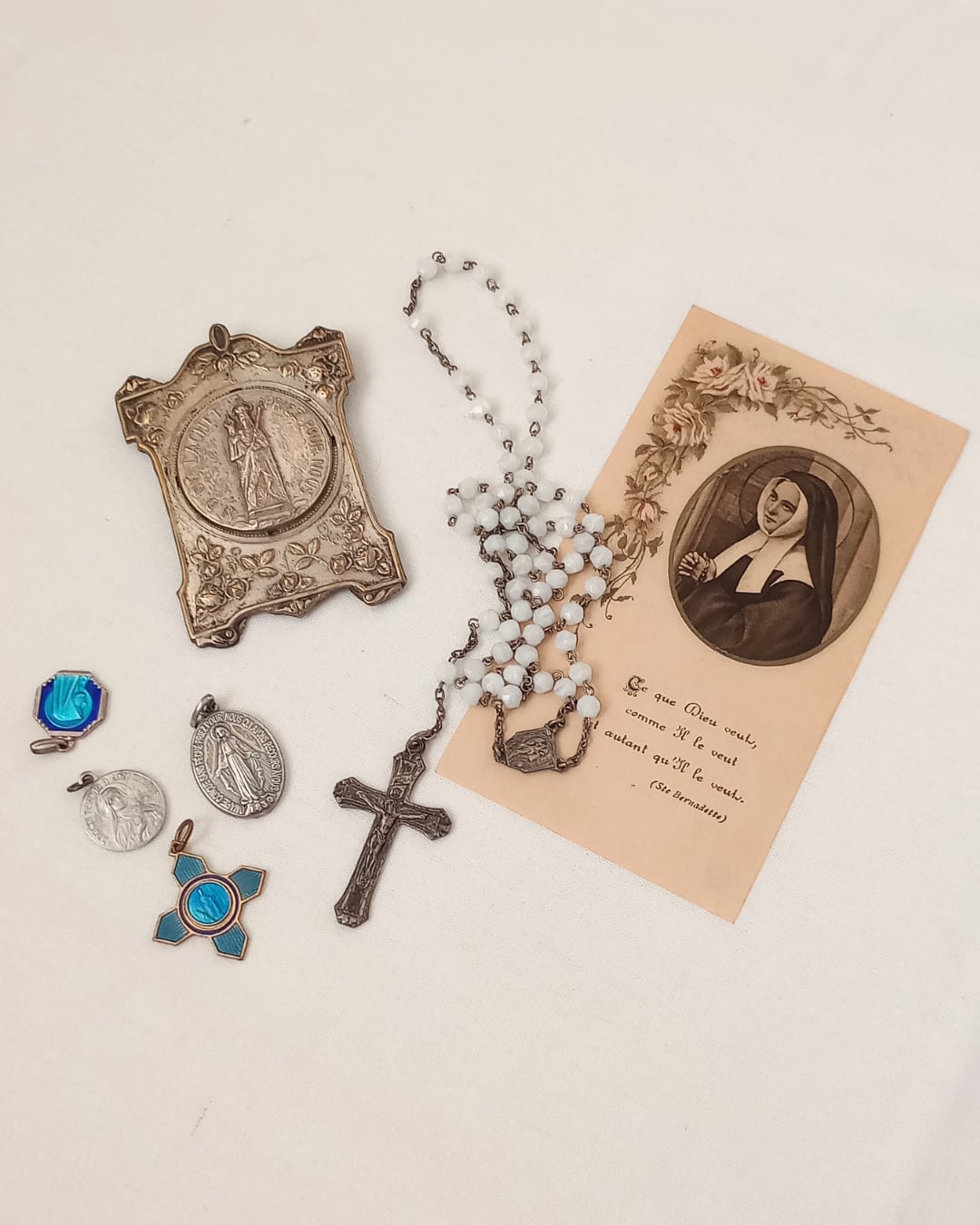 フランスより届きました、小さな古いロザリオと立てて飾るメダイ、ホーリーカード、メダイパーツの教会お土産セットです。