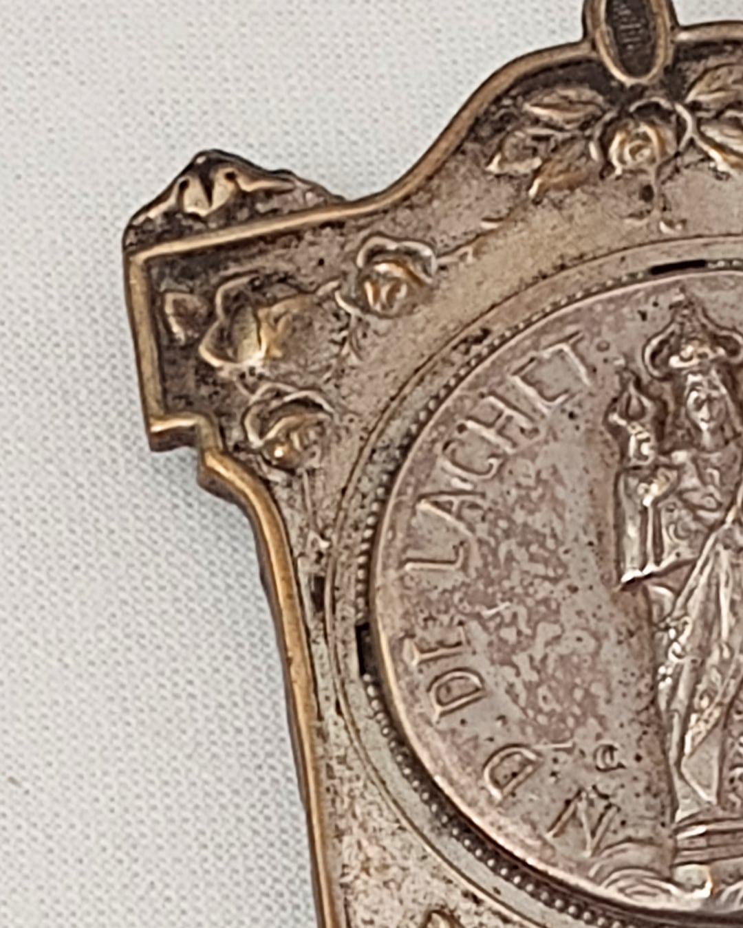 立てて飾るタイプのメダイは高さが6㎝、アルミのような素材でできております、