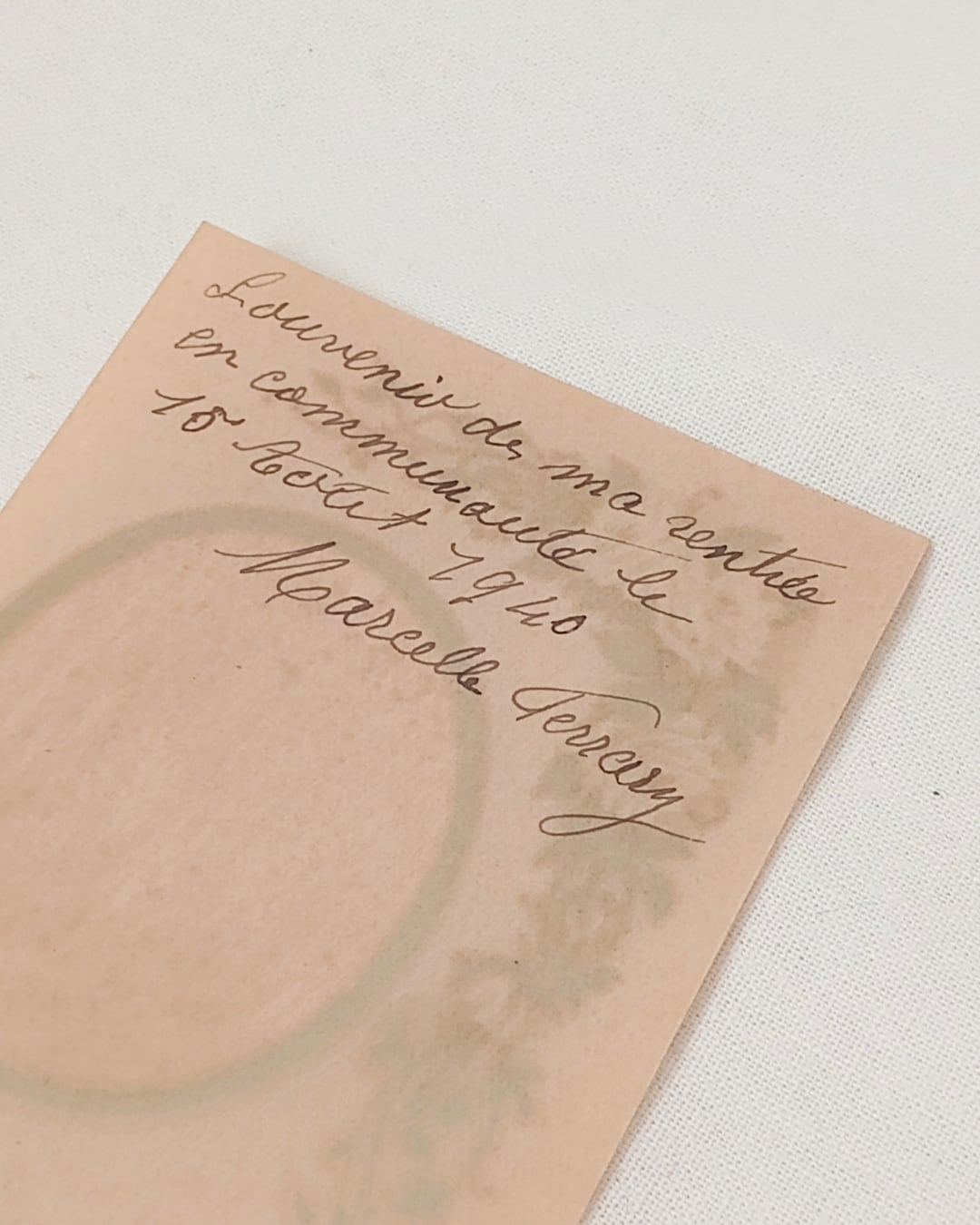 メダイパーツはメタルのものやアルミ素材のものブルーのエナメルの加工が施されたもの4種類をセットにしました。ホーリーカードは1940年のものです。