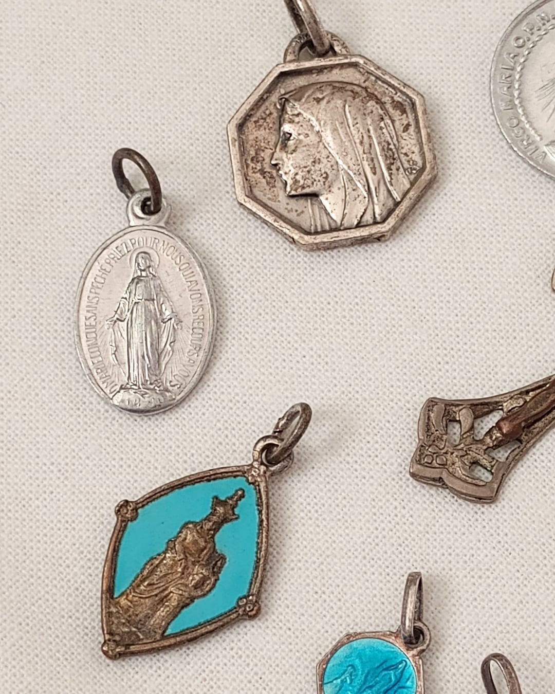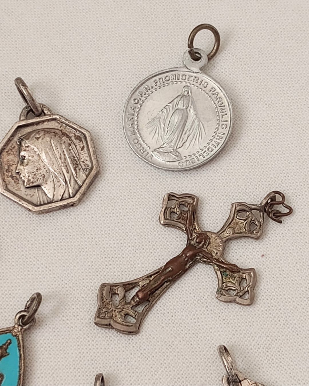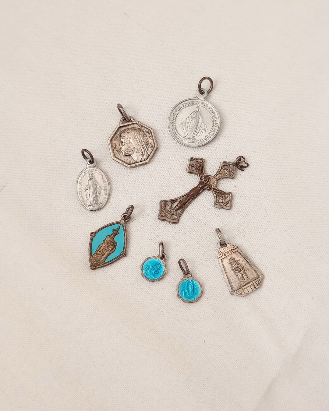 アルミのものメタルのもの、クロスタイプ、青いエナメルの施されたとてもちいさなメダイなどいろいろなタイプをセットにいたしました。