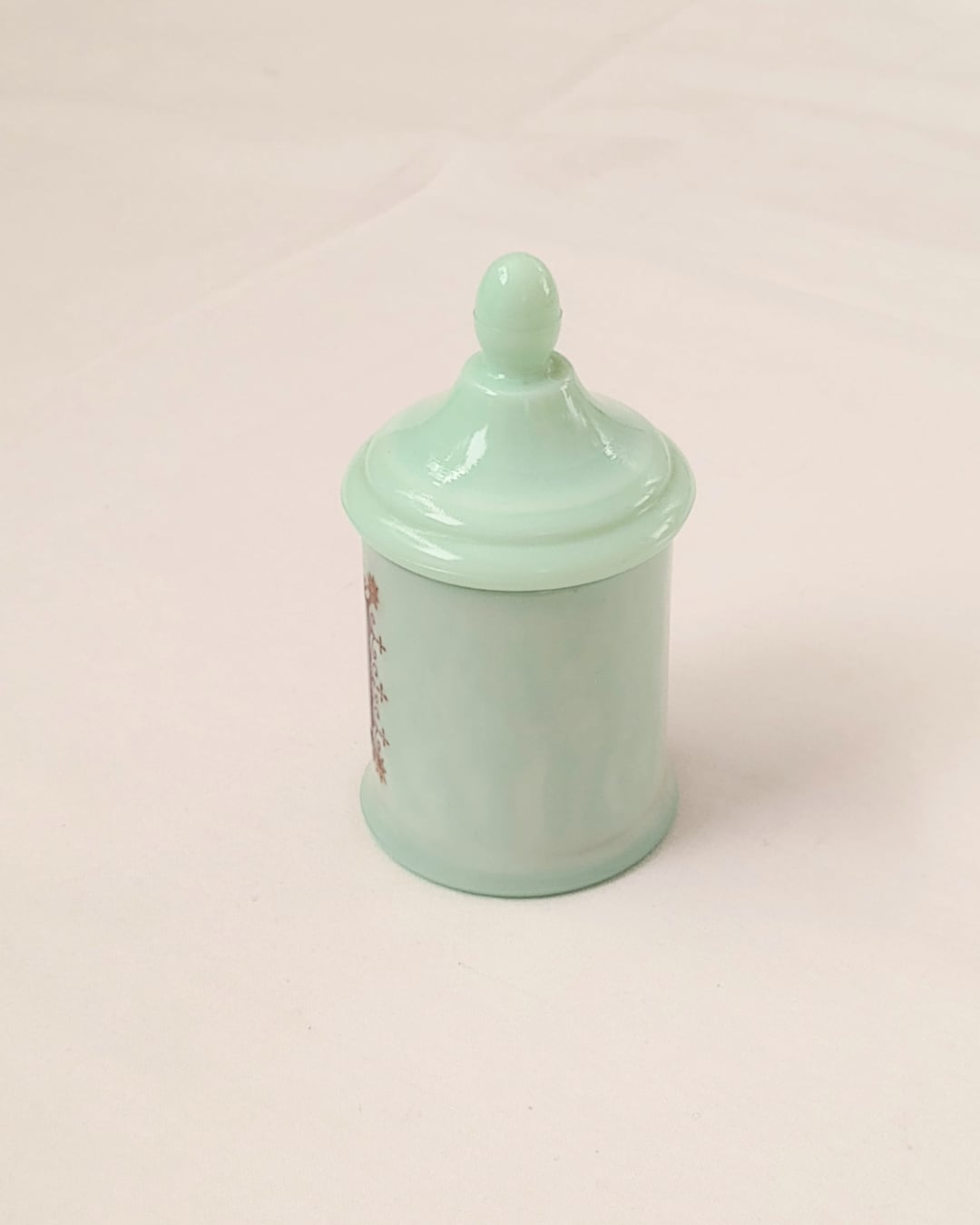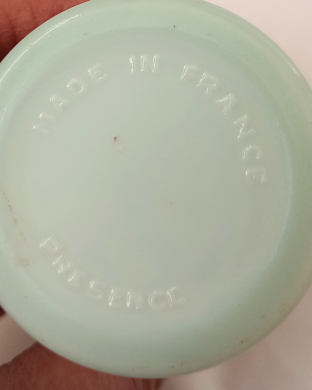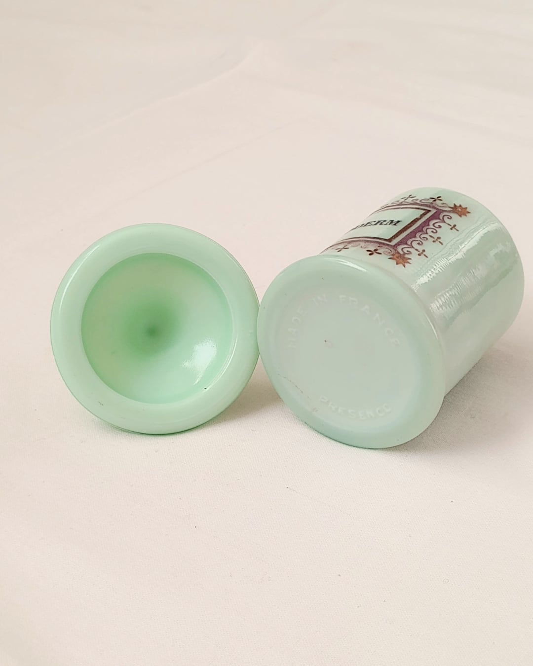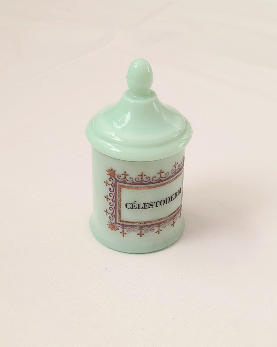 フランスより届きましたフランスの古いガラスの薬瓶、大きなものは見かけますがこちらはとても小さなサイズでディネット(おままごと)としてもお使いいただけそうなサイズです。1940年~1960年代のお品ものでお色はペールグリーン、薄い緑のお色にパープルとゴールドのCÉLESTODERMのロゴタイトルがとてもお洒落で可愛いアイテムです。