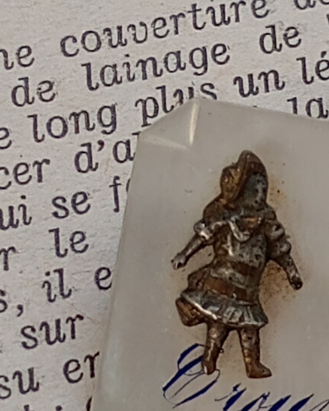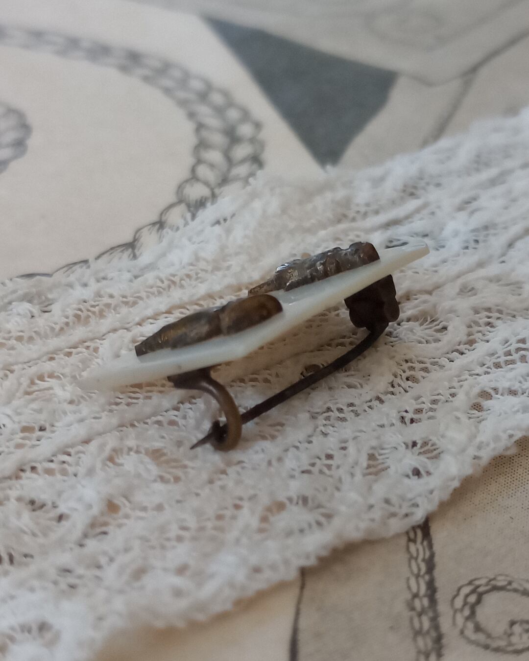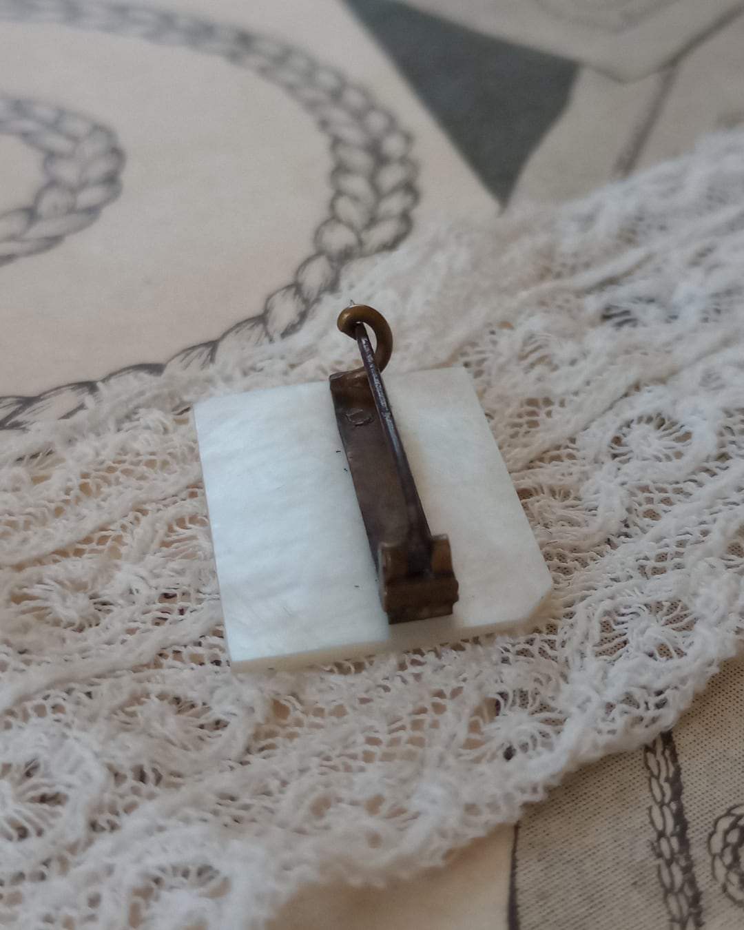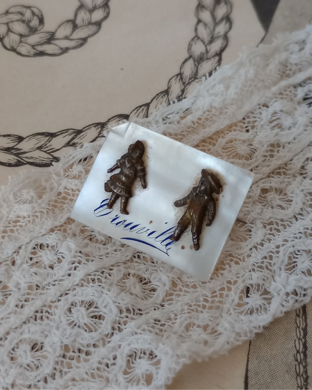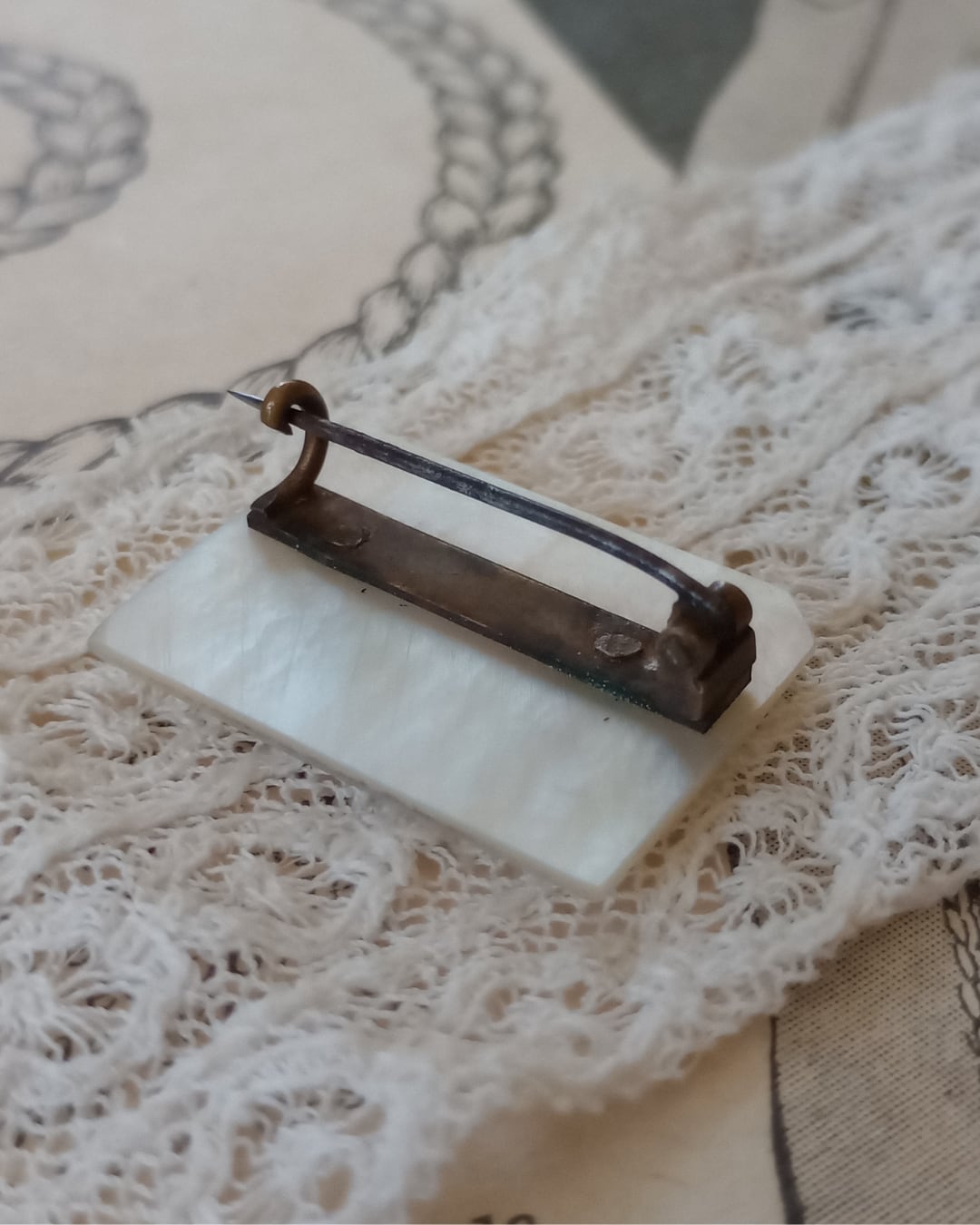 フランスより届きましたとても古いアンティークのブローチです。薄いマザーオブパールのプレートの土台に、小さな小さな男の子と女の子のパーツがついたレアなデザイン、良くるとこの四角は紙のイメージのようで角が一か所折れた細工が施されております。