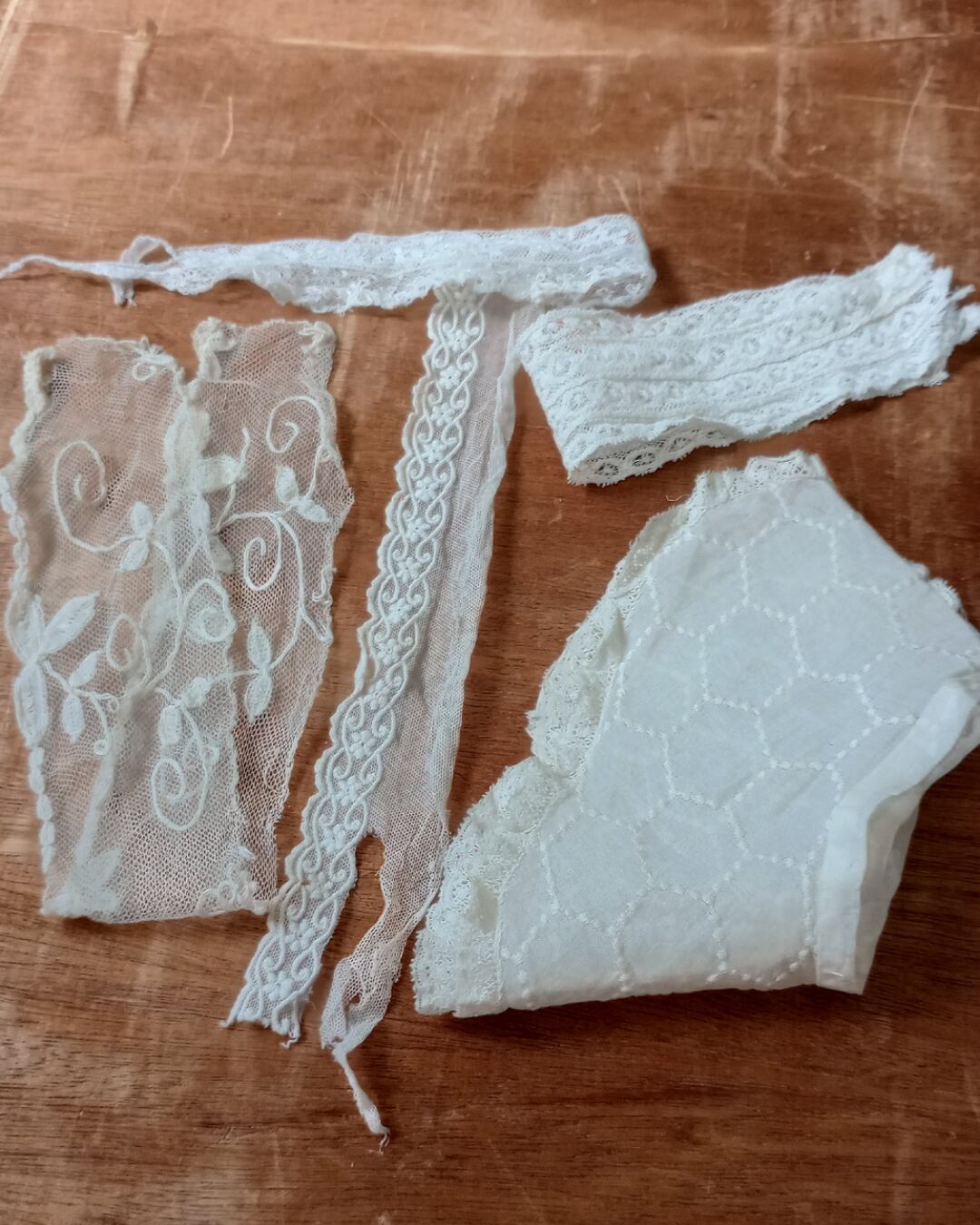 フランスより届きましたアンティークレースです、色々なタイプのレースをセットに致しました。1本ずつのサイズは載せておりませんので画像の中のメジャーの長さを参考になさって下さい。