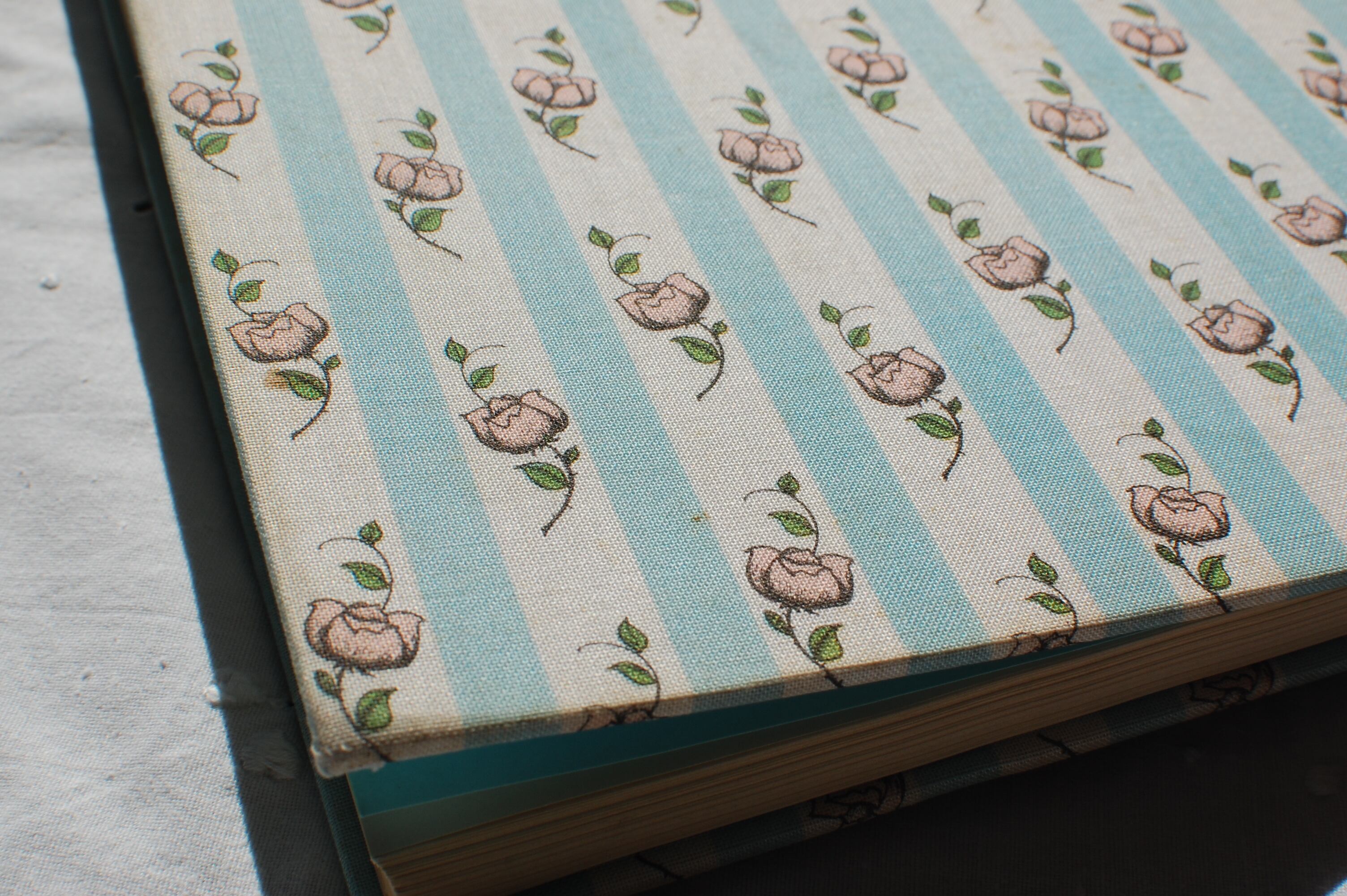 水色と白ストライプのヴィンテージの布張りになっている本で、1984年に製本された本になり40年前のものになります。表紙は反り返りがあったり、裏表紙ともに生地のダメージがございます。また表紙をめくった一枚目の水色のページに書き込みがございます。