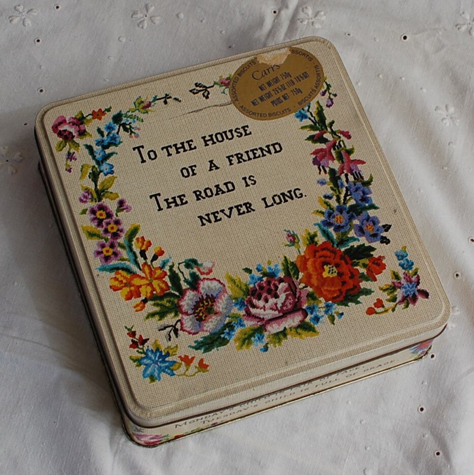 現在でも有名な1831年創業のCarrsのビスケットのTIN缶四角いタイプです。缶全体のデザインがクロスステッチの布になっていてそこに描かれたお花がとても素敵です。