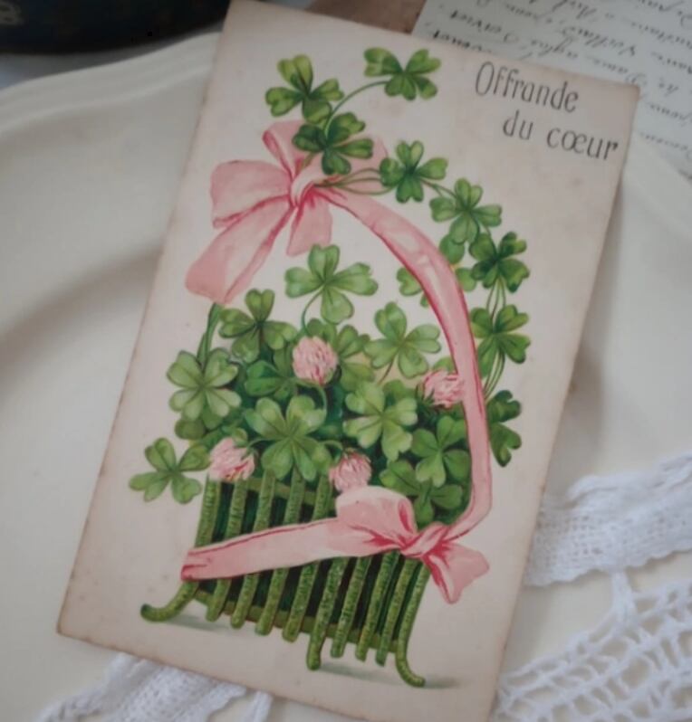 アンティークポストカード エンボスタイプ 四つ葉のクローバー バスケット