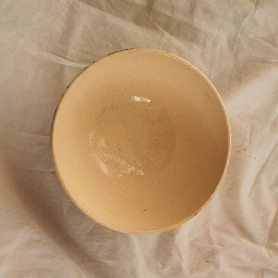 DIGOINのカフェオレボウルです。上部のふちのラインにステンシルの装飾がされており、お色味は深みのある生成りです。カップ内部の底面に小さな貫入、製造時についた小さな黒い点やひっかかりがございます。また高台部分に製造時にも引っかかりと小さな欠けがございます。フレンチカントリーな優しい印象のカフェオレボウルです。