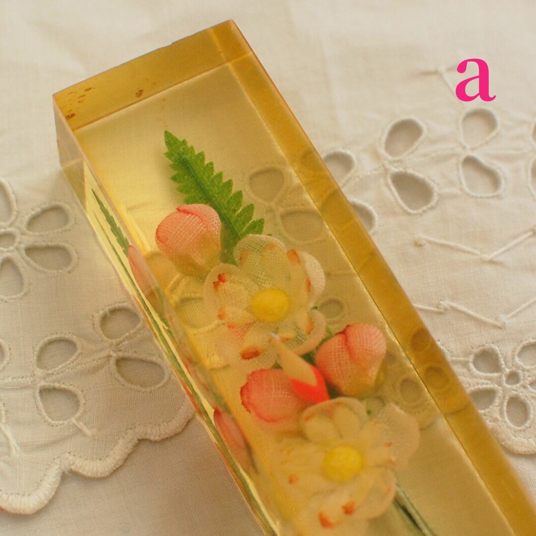 フランスより届きましたヴィンテージ(1970年代)のナイフレスト(カトラリーレスト)です。黄色のプレキシガラスの中に造花のお花が固められたものでまるで和菓子のように可愛いです。箸置きやちょっとしたペーパーウェイトとしても重宝しそうなアイテムです。