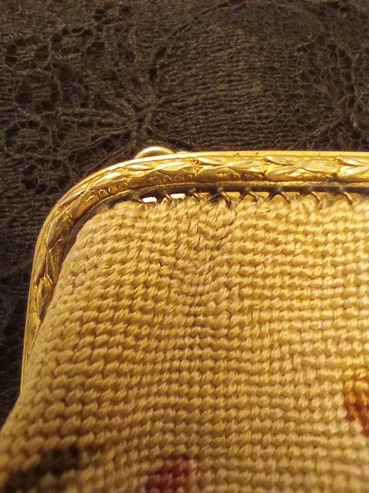 フランスより届きました、ドール用のミニバッグです。目の細かいローズ(バラ)と忘れな草のような水色のお花の刺繍が可憐にバッグいっぱいにひろがったがまぐちタイプのバッグです。くすんだゴールドカラーのチェーン、ゴールドの細い口金部分には装飾、パチッととめるらっきょう玉の部分には黒のビーズがついております。パチッと音がなってしまりますが閉めた後1~2ミリ隙間がございます。